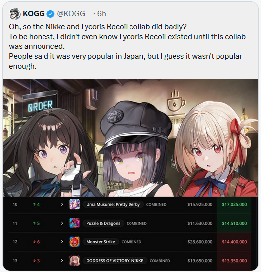 >>1966448none of the nikke collabs have done well except for stellar, dunno why they keep doing it