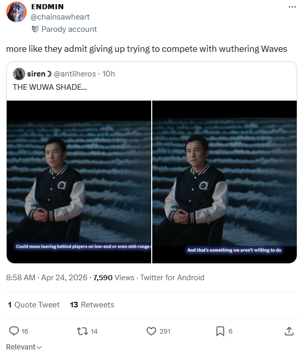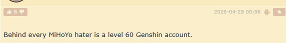Literally NO other fandom gets this defensive and pissy for dozens of hours of continuous meltdown over their game getting a tap in the shoulder. Not even hoyo.Curious that all the hoyo and wuwa usual shitposts completely stopped this entire day as well.