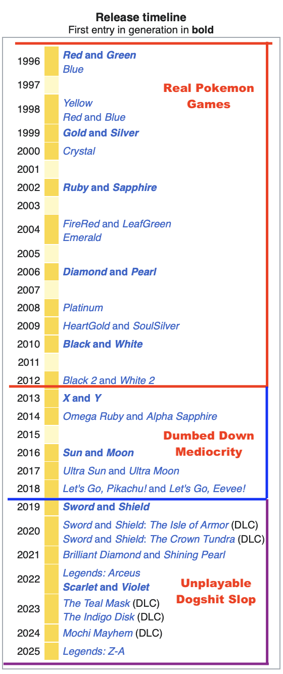 >>58841449>every kid at school played Pokemon games and damn near everyone wore at least something with Pokemon shit on it>when a kid got a new game first (Yellow and the Pikachu GBC blew people's minds), that kid became popular for a while>half the kids had some "um, actually there's a secret evolution for Rattata, NO NOT RATICATE" story because knowing something about Pokemon before everyone else was The Cool Thing>every gas station and corner store had (mostly-unlicensed) Pokemon shit in it (thinking back, some of the shit I kept finding in a local corner store might've been imported from Japan, as a bunch of Pokemon names were "wrong". God I miss that store, I think it's gone now)>some kids literally fought over whether Digimon or Pokemon was better/"cooler">everyone seemed to have That One Fat Pikachu stuffed animal>most kids played the TCG early on (before it got too complex, anyway)>you could actually find trades with kids>every new Pokemon movie the first couple gens became actual "events", everyone hyping the shit out of them and leaving the theaters fulfilled every time>kids getting hyped as hell when they got their Happy Meal gold bar Mewtwo or whatever, and half the kids breaking the Pokeball because they threw it like oneMost of Pokemania died some time around late gen 2 or early gen 3 though, it eroded down to being any other nerdy hobby. I still went to Pokemon TCG leagues up until about gen 4, where the game got a lot more complex and sweaty, as more adults started to get in with overpowered expensive meta decks just to stomp on kids.