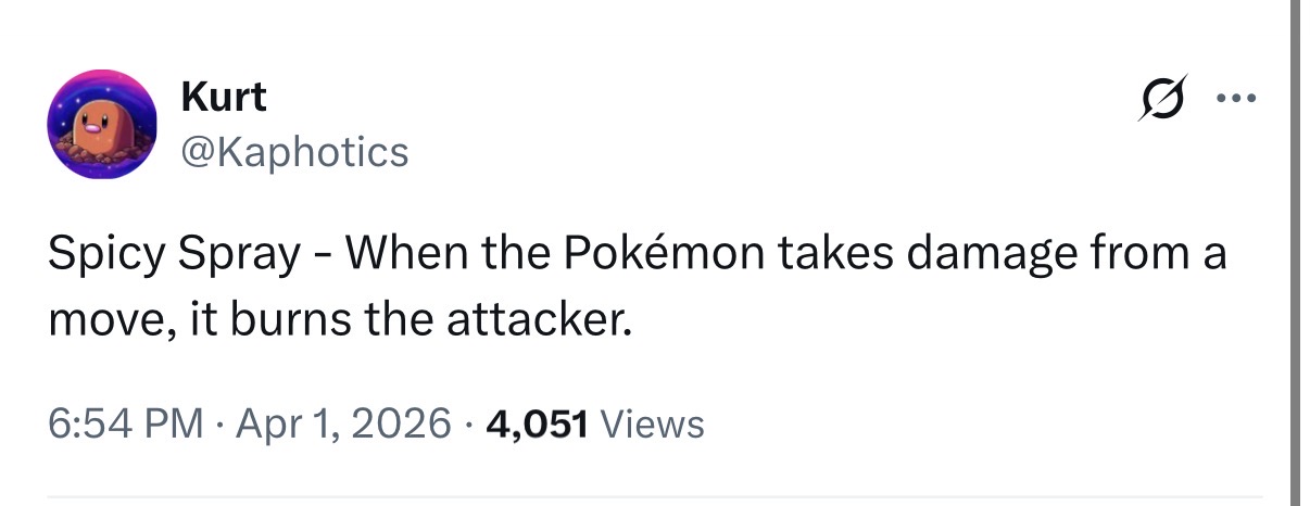>>59125457>a status may not even happenThe wording seems to imply that it's a GUARANTEED burn. Compare Flame Body>Contact with the Pokemon MAY burn the attacker.with Spicy Spray>When the Pokemon takes damage from a move, it burns the attacker.