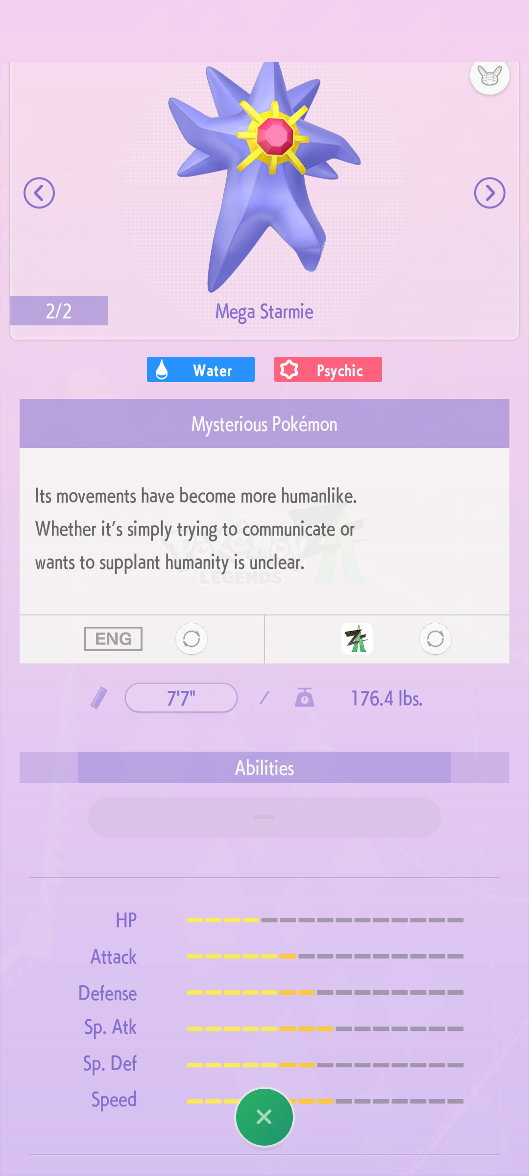 Mega Starmie's base Attack is indeed lowered from what it was in Z-A, all but confirming that it does get Pure Power or an equivalent abiliity