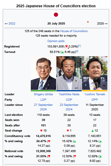 >>58384029why are you only starting to notice it nowlook at what is happening at the right wing conservative LDP party that is ruling japan for year. its popularity is at its lowest in decades. the centrist and liberal parties are rising in popularity toosame thing is happening in koreasource: https://en.wikipedia.org/wiki/2025_Japanese_House_of_Councillors_election