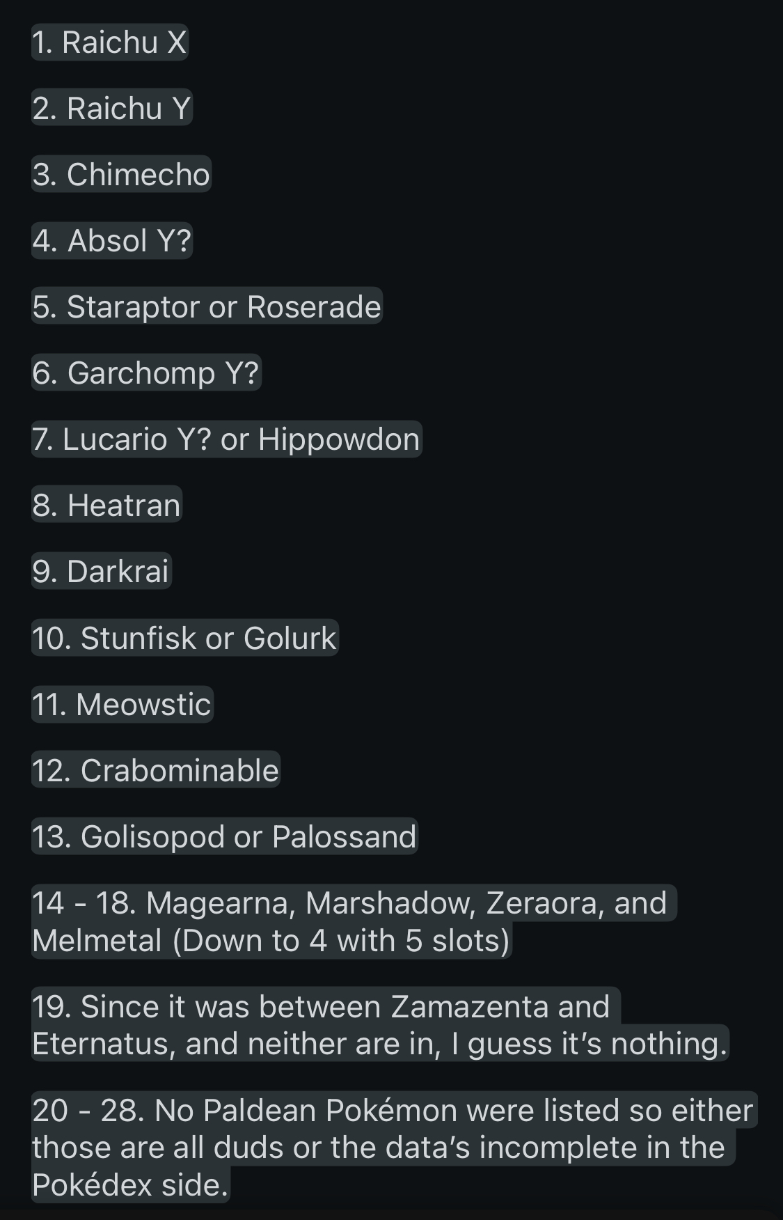 On a related note, copy pasted straight from Reddit:In the text files for all the form data, there’s scrubbed out slots that seem to indicate new Megas. There’s coincidentally 2 slots after Raichu and before Sandshrew, and then slots fitting Heatran, Darkrai, and Zeraora. Some of them are really weird though and seem to imply secondary Megas for some existing ones unless Game Freak suddenly decide to give us stuff like Mega Wynaut or Munchlax. Anyways, here’s the list I managed to come up with. Keep in mind for the Paldea Pokémon they’re listed by index number, not National Dex number.1. 0026 - Raichu X2. 0026 - Raichu Y3. 0354 - 0358 - Banette Y?, Tropius, or Chimecho4. 0359 - 0361 - Absol Y?5. 0386 - 0411 - Deoxys, Torterra, Infernape, Empoleon, Bibarel, Staraptor, Kricketune, Luxray, Roserade, Rampardos, or Bastiodon6. 0445 - 0447 - Garchomp Y?7. 0448 - 0459 - Lucario Y?, Hippowdon, Drapion, Toxicroak, Carnivine, or Lumineon8. 0484 - 0486 - Palkia, Heatran, or Regigigas9. 0487 - 0491 - Giratina, Cresselia, Phione, Manaphy, or Darkrai10. 0618 - 0627 - Stunfisk, Mienshao, Druddigon, Golurk, Bouffalant11. 0678 - 0680 - Meowstic12. 0738 - 0740 - Vikavolt or Crabominable13. 0758 - 0772 - Shiinotic, Salazzle, Bewear, Tsareena, Comfey, Oranguru, Passimian, Golisopod, Palossand, or Pyukumuku14 - 18. 0801 - 0809 - Magearna, Marshadow, Naganadel, Stakataka, Blacephalon, Zeraora, or Melmetal19. 0889 - 0890 - Zamazenta or Eternatus20. 0934 - 0945 - Palafin, Arboliva, Scovillain, Bellibolt, Revavroom, or Orthworm21. 0946 - 0951 - Maushold, Cetitan, or Baxcalibur22 - 27. 0952 - 0959 - Tatsugiri, Cyclizar, Pawmot, Kilowattrel, or Bombirdier (I’m confused on this one as there’s 6 spots but only 5 Pokémon capable of Mega Evolution in this gap)28. 0960 - 0975 - Sqwuakabilly, Flamigo, Klawf, Garganacl, Glimmora, Grafaiai, Dachsbun, Mabosstif, or Brambleghast
