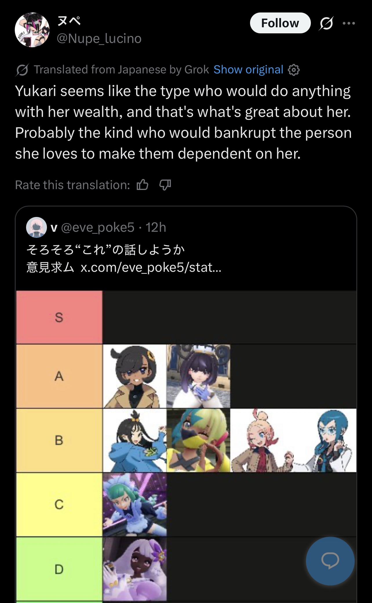 >>58435848Canari's are too, but they keep talking about Iono instead lmao. Also translated the tweet because whoever screencapped it didn't want to reveal the bait>Should we talk about this soon? Looking for opinionsDoesn't sound like a sample size tier list to me
