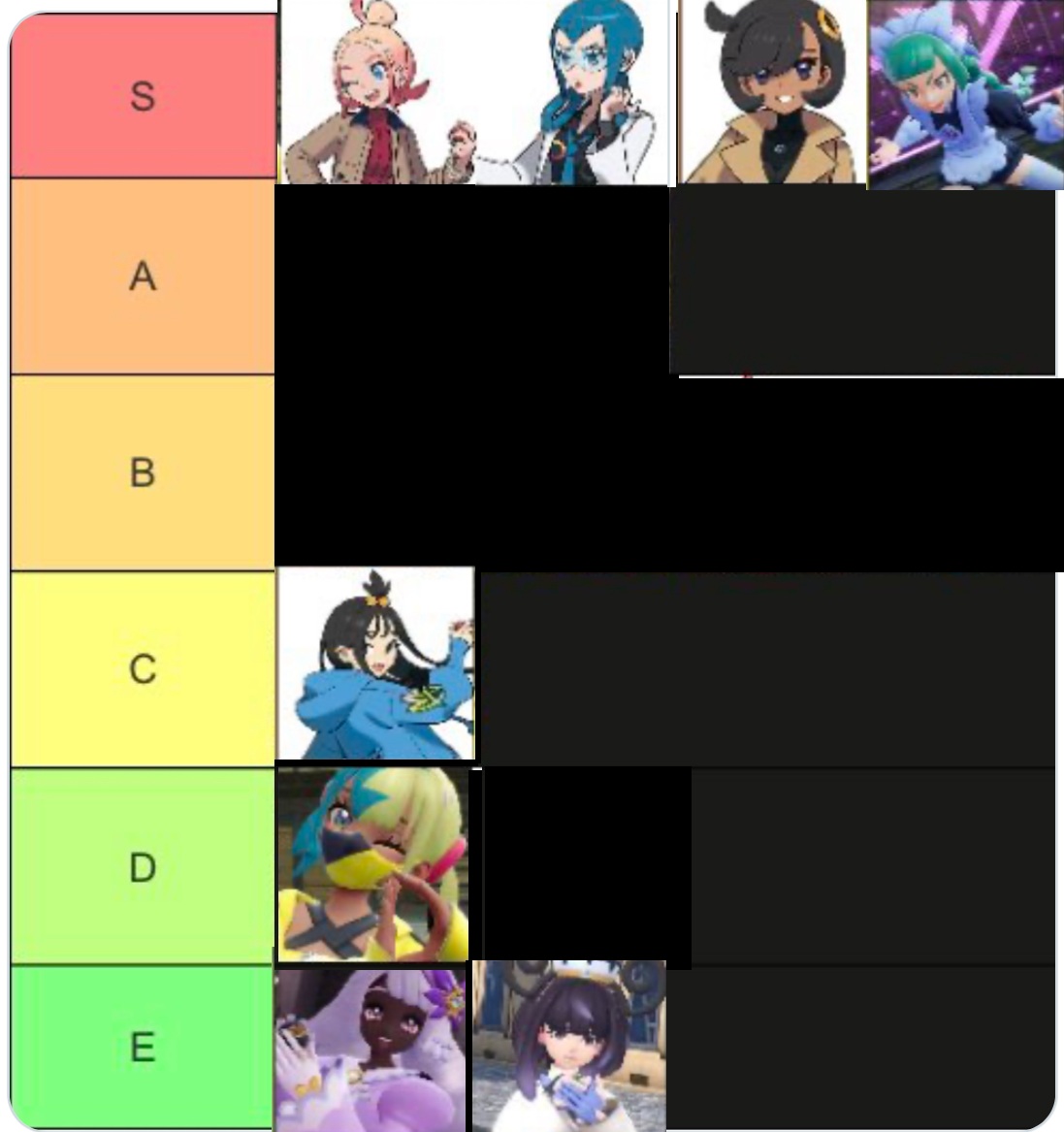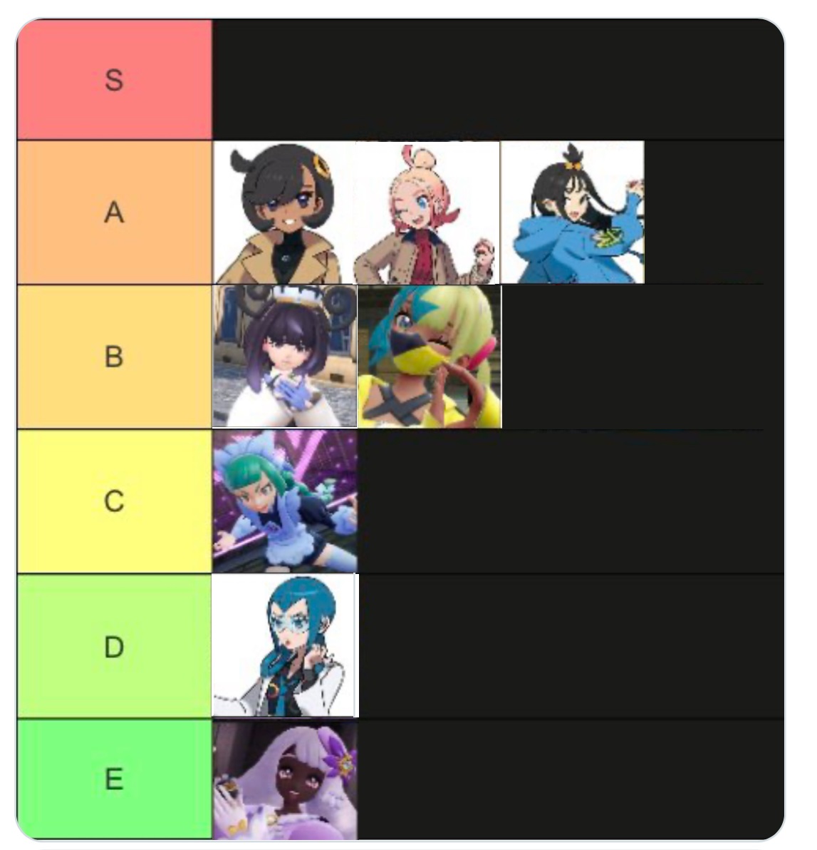 >>58436313>Taunie in A>Lida in C>Canari in DIve got absolutely no idea what your criteria is but if its fappability you have some shit taste. Taunie is kind of sex but as you play the story you realize shes one of those bullet dodged/all your friends tell you to leave her kind of girl and is really a D. Lida is at least B because shes practically your human battle partnerAnd you need to just consider yourself gay for putting Canari in D. You know shes an S