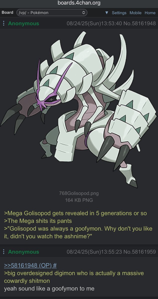 People saying Golisopod is already goofy and will therefore have a goofy looking Mega are completely missing the point of it, which is that it juxtaposes a badass intimidating design with the personality of a lovable coward. Giving it a goofy design would completely ruin it both visually and conceptually (which is why it will indeed probably get a goofy looking Mega because Game Freak are fucking idiots).