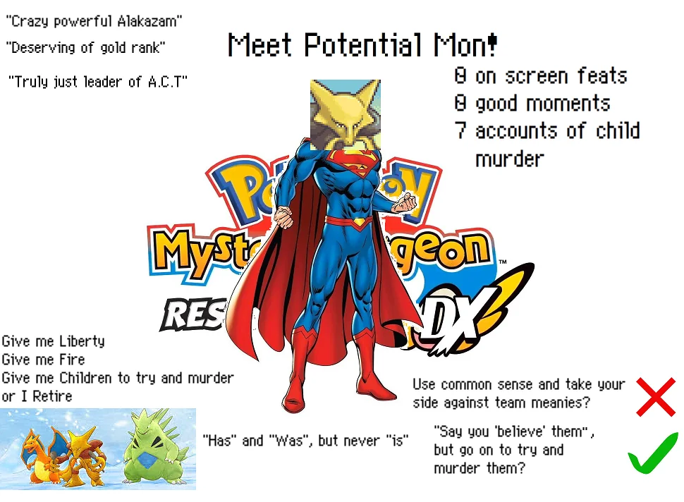 >>58449253What fucking stakes? "Will my character get their neck snapped by Alakazam on-screen in this game for kids aged 7 and up?" You can have stakes about the fate of the world and how that one will shake up without making all major characters drooling morons.The only evidence that a cursed human has anything to do with the natural disasters is an ancient legend, and the only evidence that the MC is the human in question comes from Gengar accusing you with absolutely no proof, and the main character not denying it sufficiently vehemently. I don't remember what exactly Xatu said, but he didn't offer anything conclusive either. And it's not like townies hear from Xatu, they hear from Gengar saying that's what Xatu said. Again, I can buy Gengar riling a crowd, I can not buy multiple rescue teams giving it no further thought and chasing you for multiple days.You can't just decide something must have happened when the game never mentions it or suggests it in any way. Also, what time skip? You're on a run and being chased for the entire arc. Alakazam couldn't have time to investigate anything because he was chasing you.Even Gengar's actions make no fucking sense. You learn that there's another human beside you, possibly the only being in the world that you could relate to, and your first instinct is to use that information to try to get them murdered? WHY? There's a big gap between being a dickhead and trying to get you killed. And the game never even directly acknowledges the fact that Gengar KNEW you're not the cursed human, so he wasn't just making shit up, he was lying about it, to try to kill you.