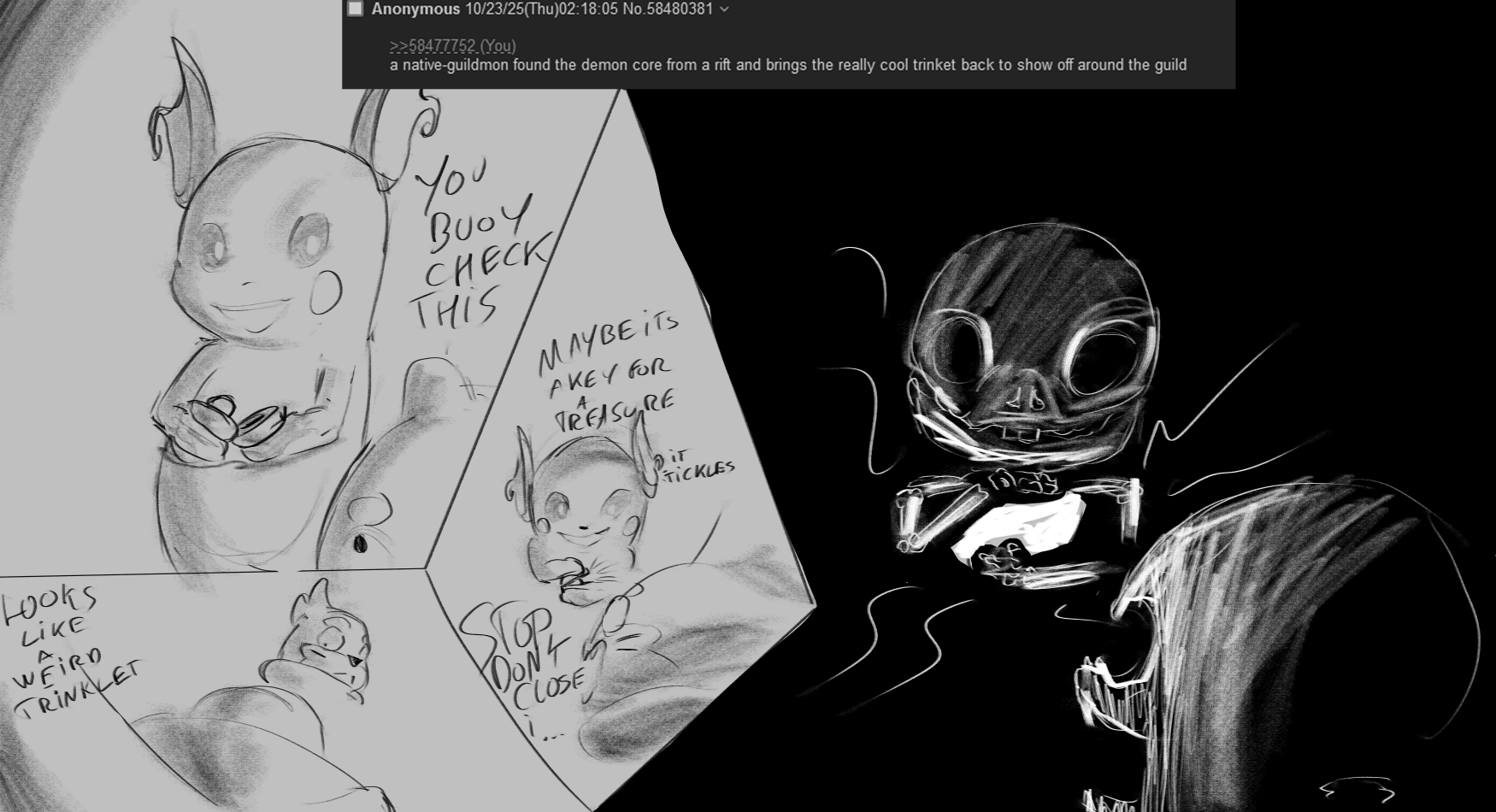 >>58477752a native-guildmon found the demon core from a rift and brings the really cool trinket back to show off around the guild