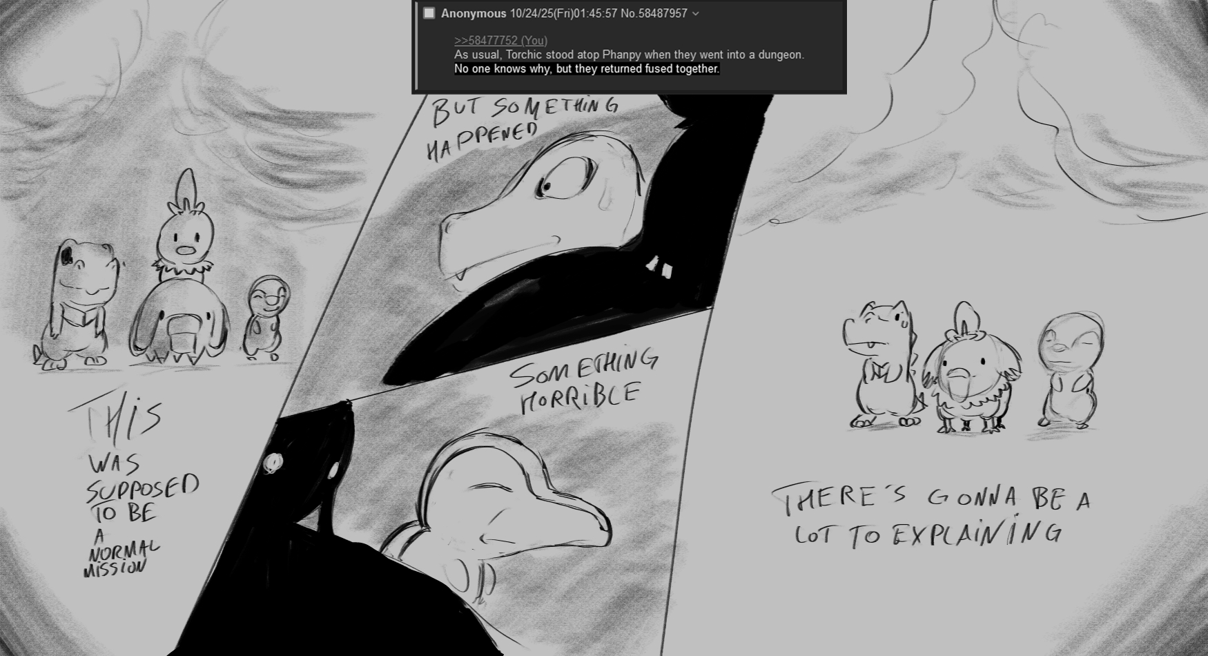 >>58477752As usual, Torchic stood atop Phanpy when they went into a dungeon.No one knows why, but they returned fused together.