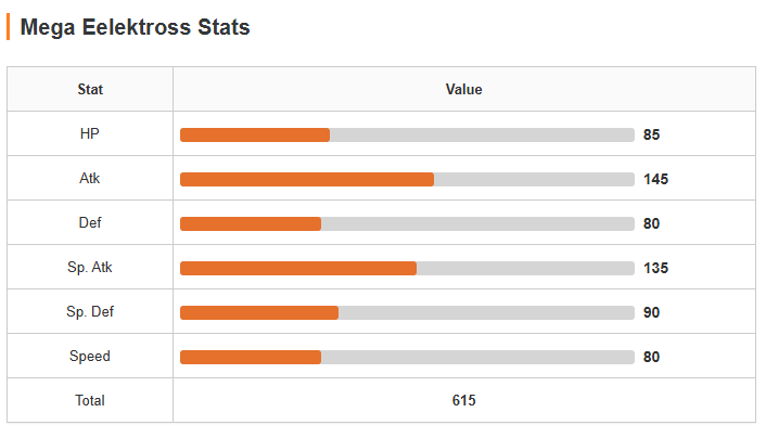 >Waste 60 stats in spatk and speed and a meager 10 in only special defenseI was hoping for them to make the coil sets better but I suppose flamethrower/giga drain maybe acid spray coming off a real spatk could do something but they really turned mega Eelektross it's still a slowish frail mixed attacker
