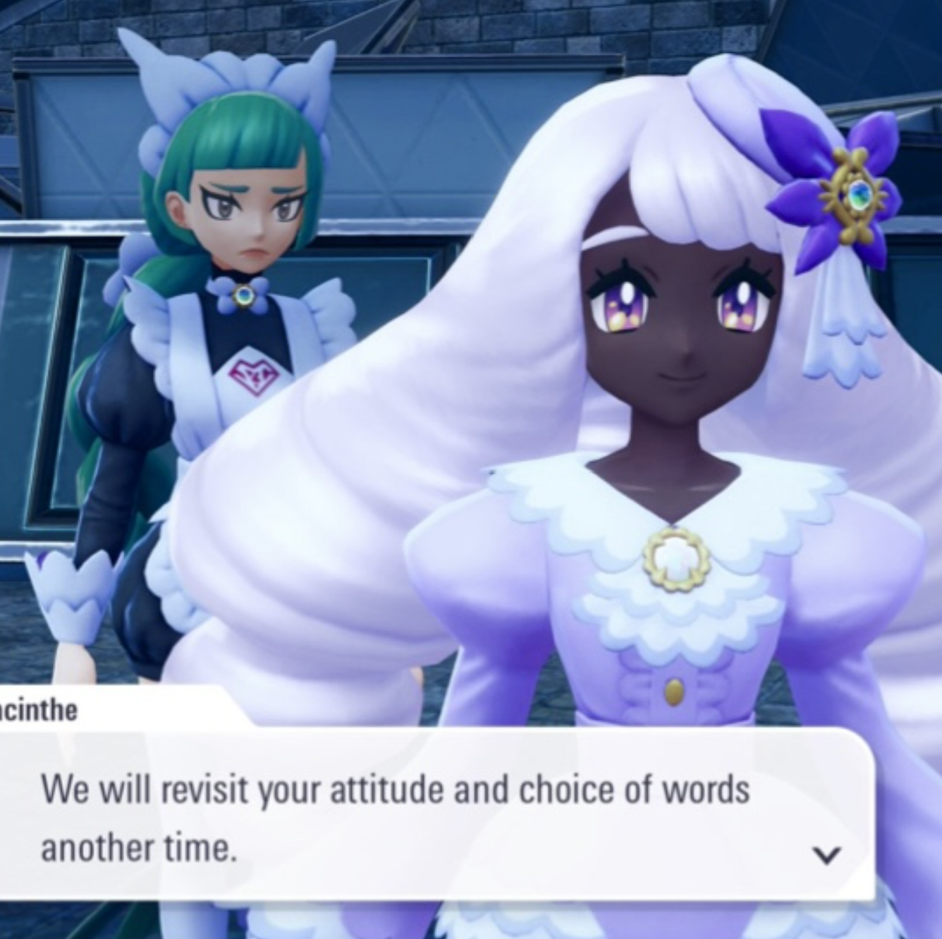 Any more examples of npcs talking about Jacinthe? I heard about an SBC trainer who, after you defeat him, says Jacinthe will lock him in the Jacinthe zone as punishment but I haven’t found screenshots yet. Corbeau seething is hilarious because she probably doesn’t even give a shit about him