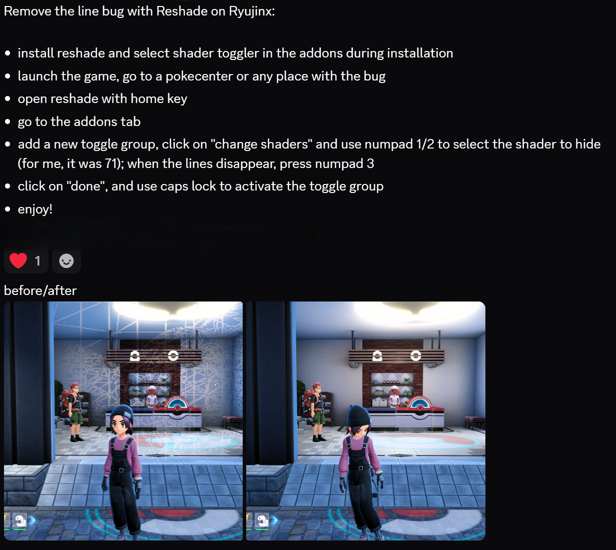 >>58496618>better framerateuse lossless scaling. 60fps mod will cause attack hitboxes to bug out>pop-inreshade shader toggle add-on. only works on vulkan, which is more crash-prone than opengl, so there is a tradeoff. you will have to save often>lighting bugsthe reshade shader toggle can fix them at the cost of removing certain lighting effects. i've noticed that fixing the pokecenter lines will also delete the lamp glows in other areas