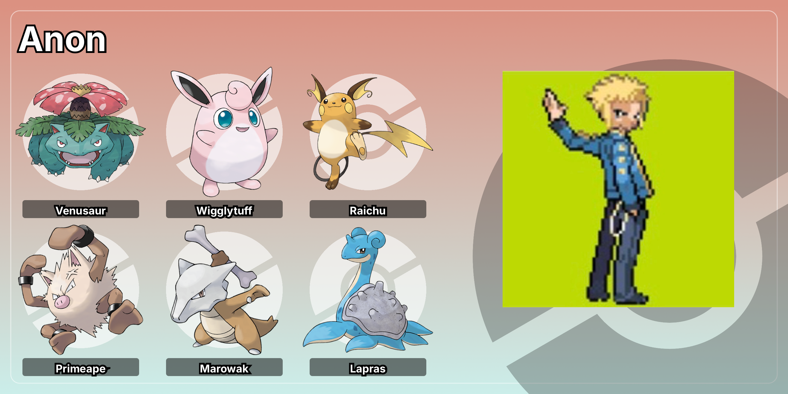 >>58478248>TQSo dumb story, MySpace was the big thing back when DPPt came out and because I was not a super cool kid, my profile page was pimped out with lots of HTML bling and decor. One of the things you could make to add to your profile back then was custom Pokemon trainer ID cards, similar to what you got in the game back then but with more options. It was basically a neat way to share your trainer ID for online features. You’d choose what all Pokemon you wanted displayed on your team, your background color, badges, etc. and you could choose any trainer sprite in any of the games that you wanted to represent you as a trainer. So anyway, the only trainer who looked the closest thing to what I actually looked like IRL back in Gen 4 was sadly Volkner, so I used him as my stand in (for the record, we don’t actually look very similar, there were just no short-haired blonde female trainers back then. Also Volkner looked badass). I think I grew a soft spot for him from there. He was a bit relatable on too many levels. I could go on but I won’t, but that’s my stupid love story. Picrel I found a site and remade an example card real quick
