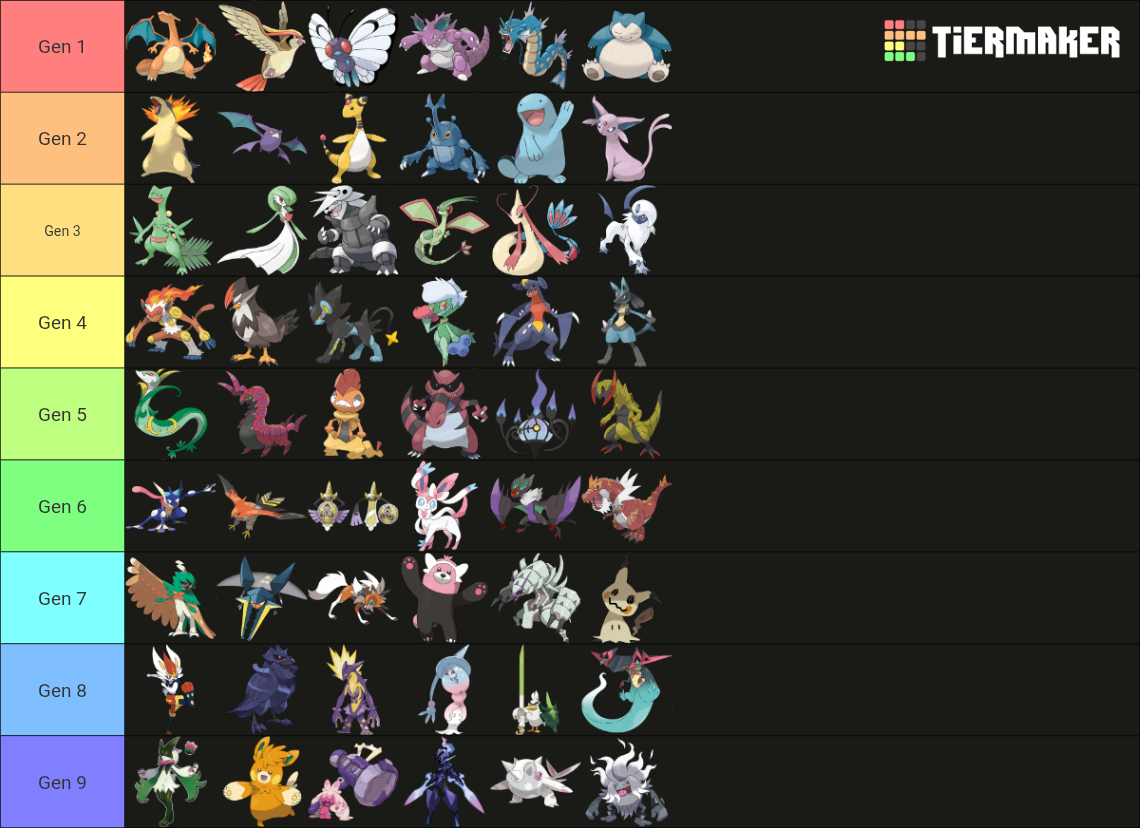 >>58483403I think there’s really only a “default team” for Gens 1-4. After 5 the variety becomes too impressive to predict. The only change I’d make to Gens 1-4 is maybe Primeape or a Hitmon instead of Butterfree, and Red Gyarados definitely needs to be on Johto. For Hoenn I’d say Swampert is more popular than Sceptile, and then you can swap Milotic for Breloom. Gen 4 everyone knows that’s the team lol. But yeah Gen 5+ there isn’t really a default. Gen 6 people definitely used the Kanto starter plus Lucario. 6 on, nobody but /vp/ nerds went out of their way to use strictly new mons, that’s just our own autism speaking.
