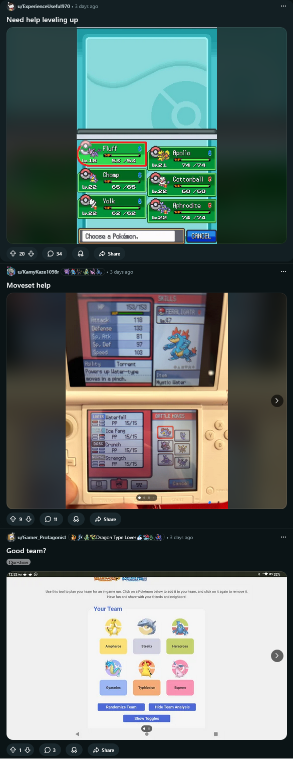 >>58483661Johto is worse for me. Yes the DP meme team is real but that's literally because all 6 of those people are popular, many of them are available early route, and gift mon (riolu). That does not stop people from using Gastrodon instead of Floatzle, Hippowdon instead of Garchomp or even Gliscor, Leafeon/Abomasnow instead of Roserade etc.... All good decent options for playthrough. But those mons in the meme are easy to get and strong to use so of course people are going to use it.Meanwhile everytime I or I watch other people play Johto, their team always has Starter/Ampharos/Eeveelution/Gyarados/Crobat because your only other options are using more Kanto mons or just complete trash. Not that I don't want to use different pokemon, but the options are geniunely so much worse why would I even bother