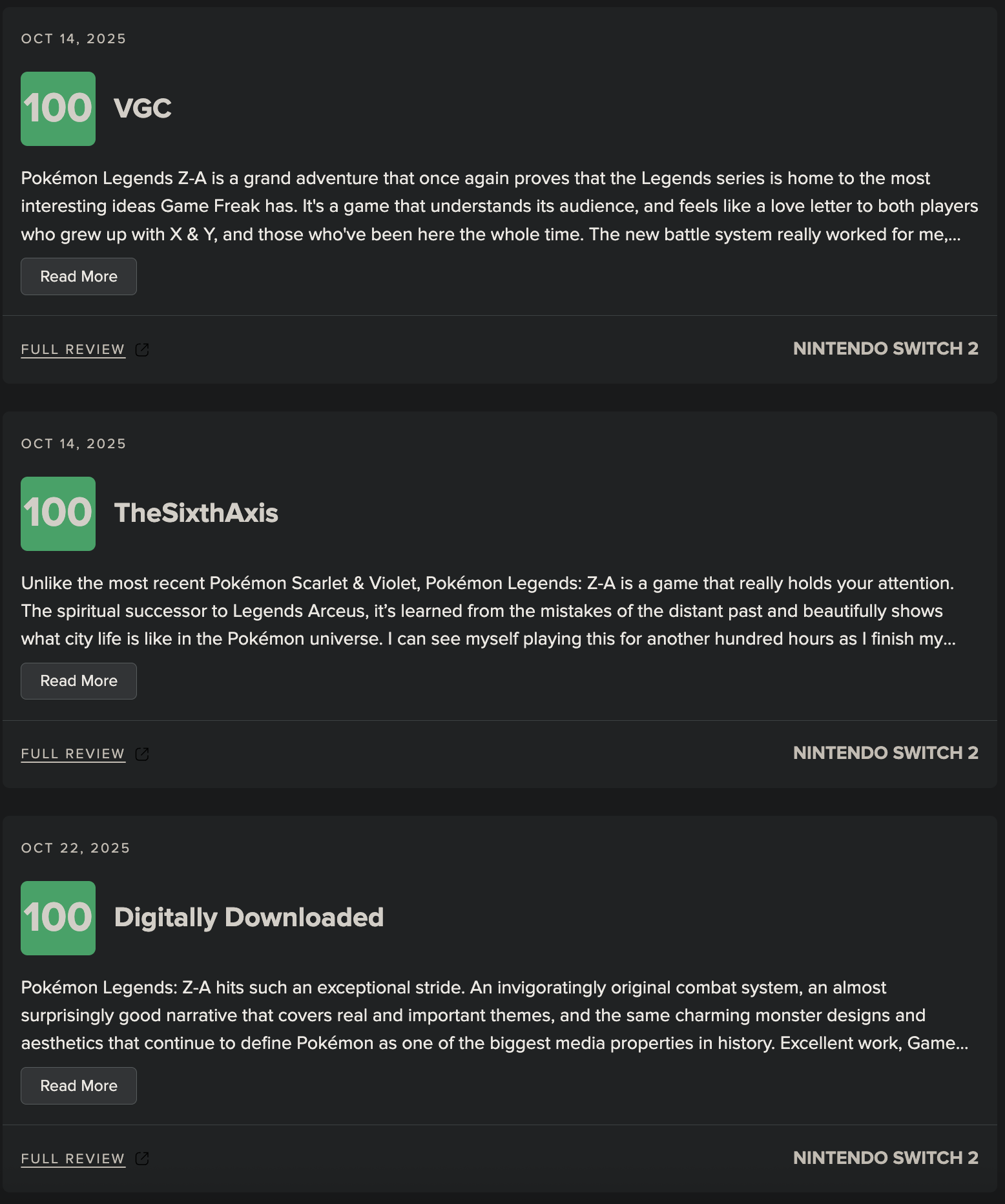 >>58501492If you want real fun, whenever some highly-shilled game/movie comes out, actually READ the 10/10 critic reviews (preferably through an archive), it's baffling how these people can be real, how they'll do shit like absolutely bukakke a common gameplay mechanic as being incredible, or spend a couple paragraphs on how [actress] was the showstopper of the movie.Sometimes you can catch them latching onto something and making THAT be the deciding factor of the score, too, like an in-depth character creator that they spent hours on, or forgoing the "game" itself to spend 8 hours on the romance mechanics because they found a character they really like.Plus they don't have to factor in the price of the game/console because they rarely have to buy them themselves.Reviews get a lot more favorable when "what the fuck, I paid $70(+) for THIS?" isn't a factor.>>58501781Note that most of the reviews in these screencaps are of the ""Switch 2 edition"". It's still not a 10/10 on Switch 1, but on a next-gen console? Fuck, man, there's Gamecube games that look better.Nigga, PLZA's STILL using the 3DS models for the Pokemon, minus a few that were manually updated selectively, you can do shit like count the verts on some Pokemon, plus all the flat walls and such should be unacceptable on a brand-new next-gen console you spent $700+ on.Not like most reviewers even have to buy their consoles anyway, funded either by the company they work for, or Nintendo themselves.>>58505660 (me)Forgot to mention I find it extra funny that whenever GF makes a non-Pokemon game, people jump and yell to try to get people to buy it, for various reasons.Even with all that free "marketing", most/all their non-Pokemon games flop hard, putting them even firmer under TPC/Nintendo's thumb.