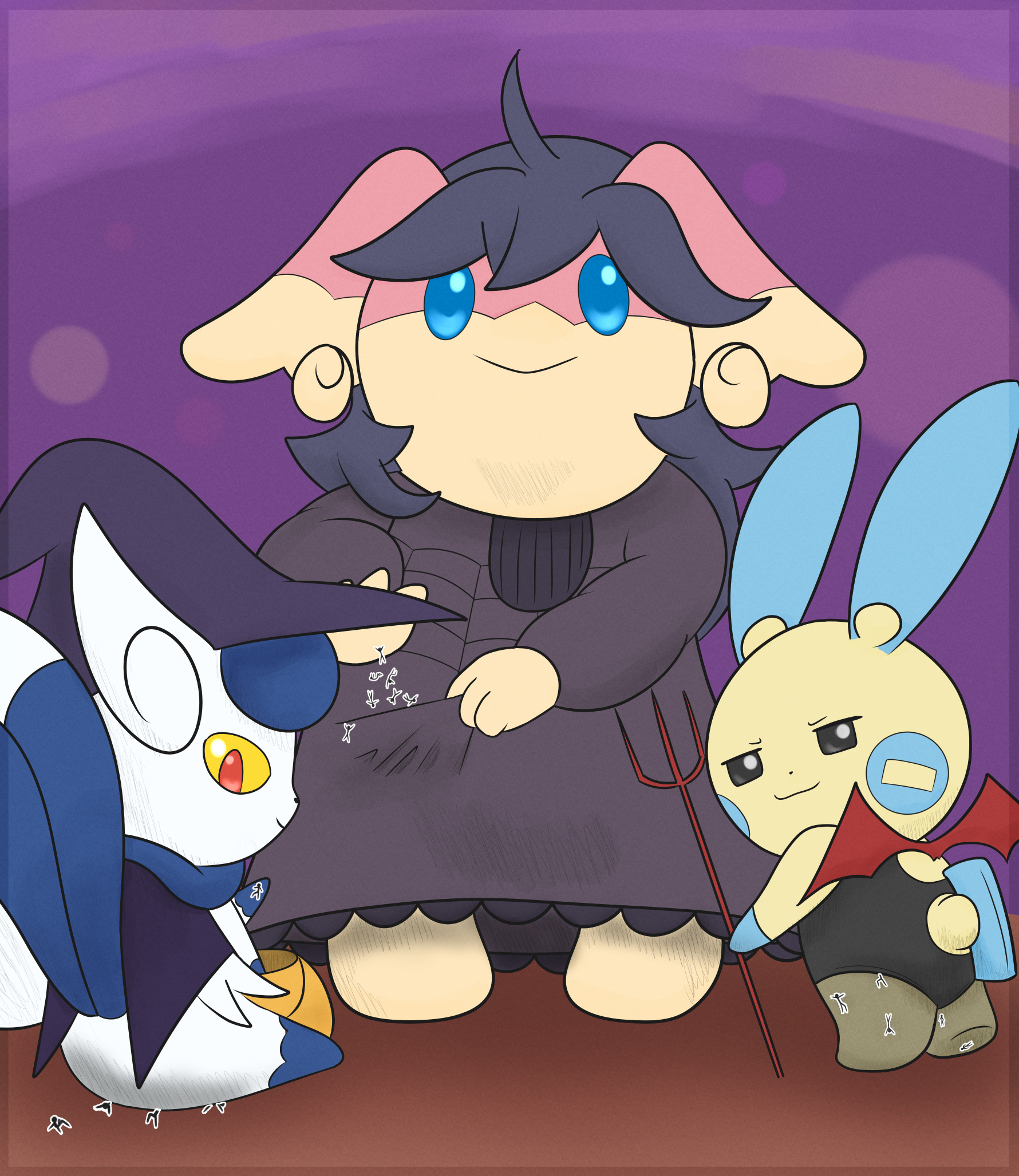 >>58522060Minun, Femstic and Audino going trick or treating in their costumes. Femstic sitting on her treats, Audino putting them in a pocket, Minun putting them in her Halloween tights The treats are humans ofc.