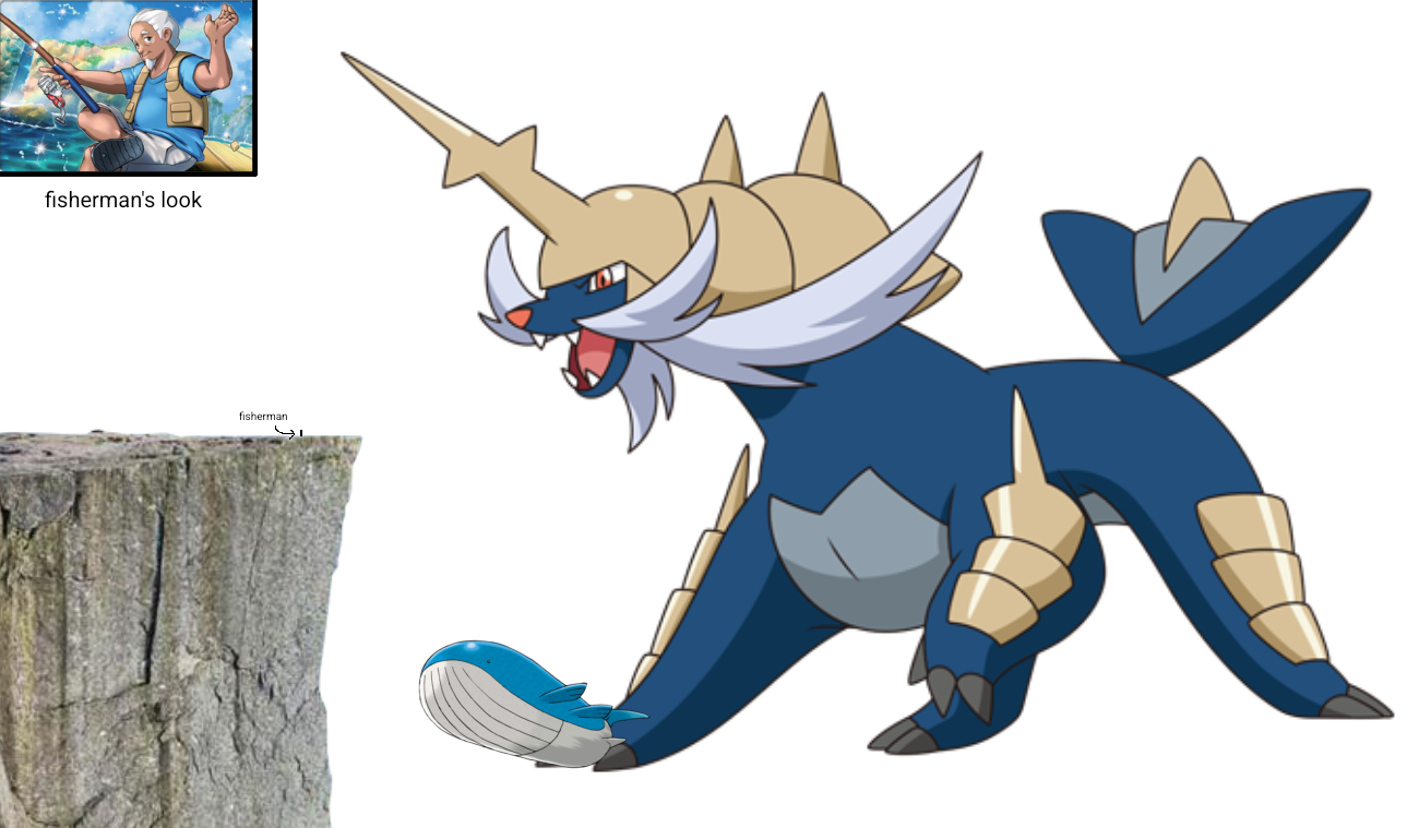 >>58522060A big Samurott proudly showing to his fisherman friend his Catch: A full Shiny Wailord, gripped in his mouth. The fisherman, standing near the edge of a Clifford, is congratulating his large Pokémon on the shiny he got, while the Blimp Whale is rather annoyed at the situation.Pic for scale and for the fisherman's look.