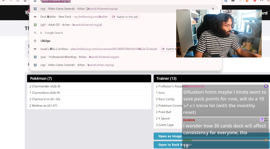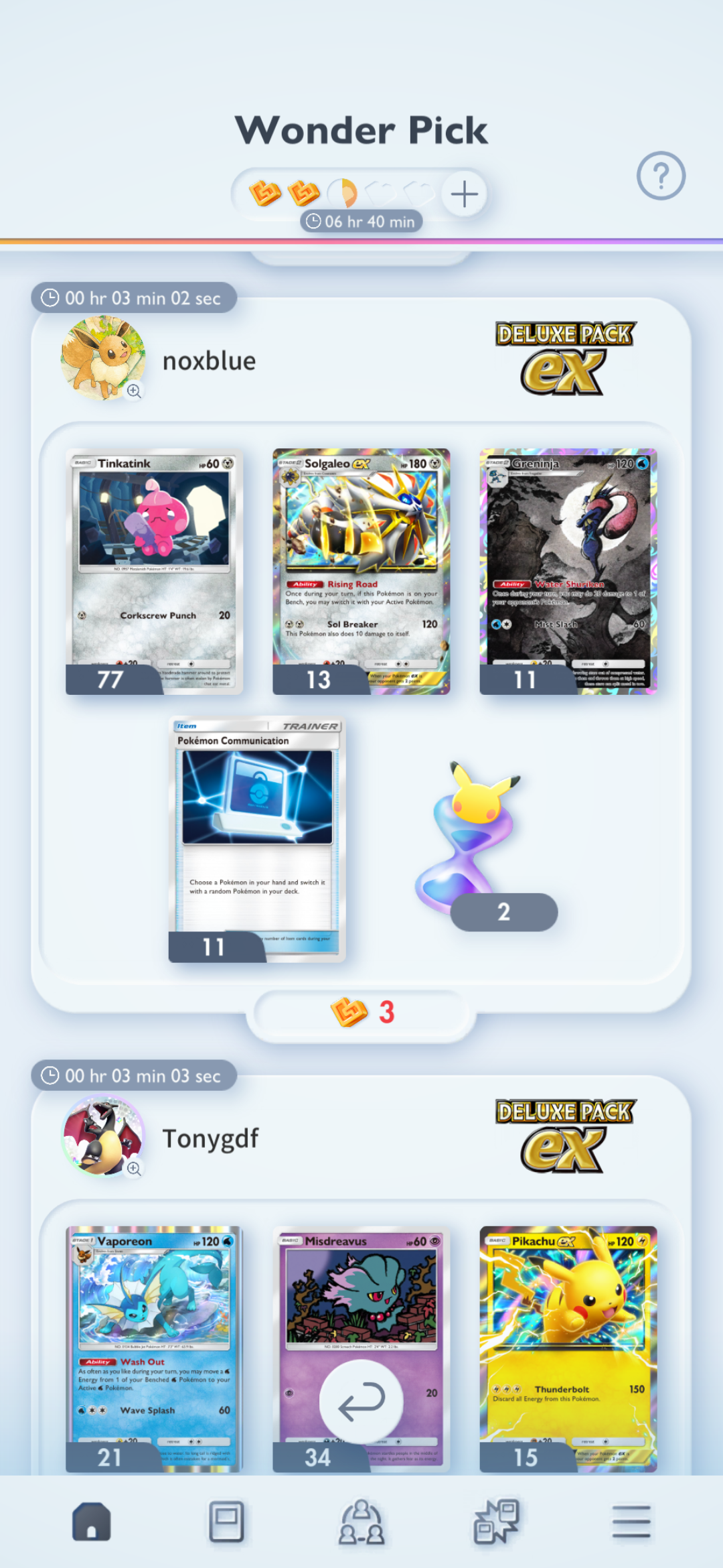 End of A>Friend ID Survey: https://forms.gle/AZyQQ2SfGeCKjXNh9>Friend ID Sheet: https://docs.google.com/spreadsheets/d/1DGhOfaMX6D_YUR-P39_OJdVmAl0uacohIRstE9oN9SQ/edit?usp=sharing>Tournament results/decklists: https://play.limitlesstcg.com/tournaments/completed?game=POCKET>Deck Builder: https://my.limitlesstcg.com/builder>Datamines, etc.: https://ptcgp.raenonx.cc/en>Luck calculator: https://porygonthree.github.io/ptcgp-luck-calculator/>Advanced Card search: https://pocket.limitlesstcg.com/advanced>Deluxe Pack: ex card list: https://www.pokemon-zone.com/sets/a4b/>Mega Rising soon: https://www.pokemon-zone.com/sets/b1//vp/ battle passwords to battle with other Anons (consider writing a post to recruit players)>/vp/‘s own meta (no random effects, no ex): vpnx>meta decks or high level play: vpmeta>/vp/ anything: vpPrevious Thread: >>58513526