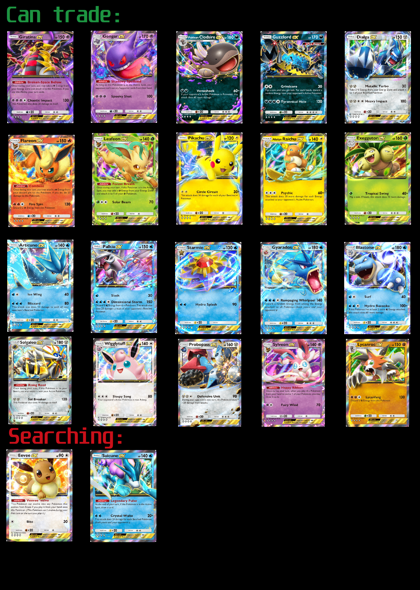 >>58527508May, Blaziken, Lisa, Altari mainly. Gyarados might be good, people forget how broken normal ex gyarados is when it actually gets out. This set is interesting
