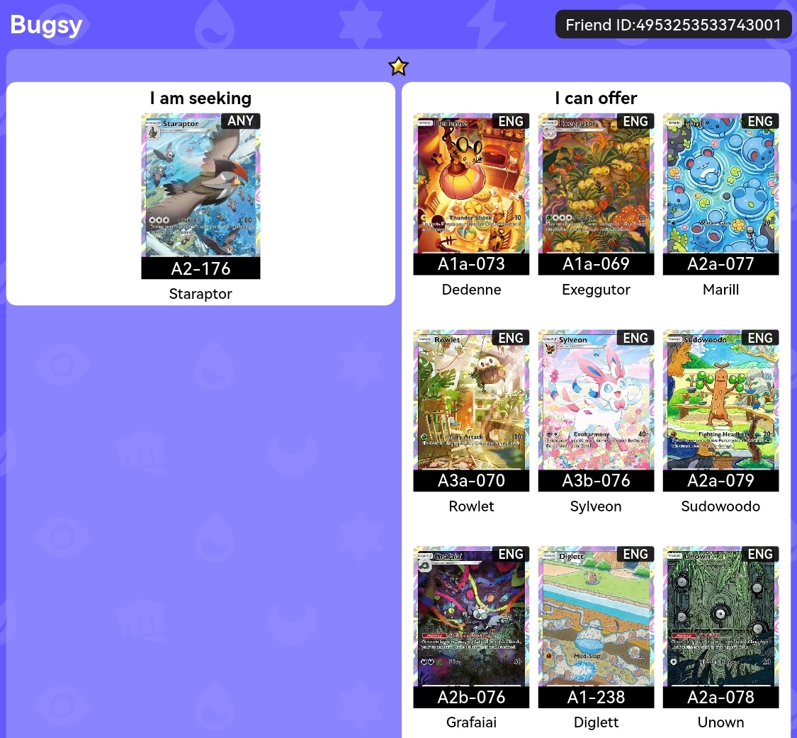>>58526889do you have a spare Shuckle ex, specifically from the Lugia/Ho-oh set? Have one from the deluxe set but it won't register in the original set till 2026, wouldn't mind getting it earlier.