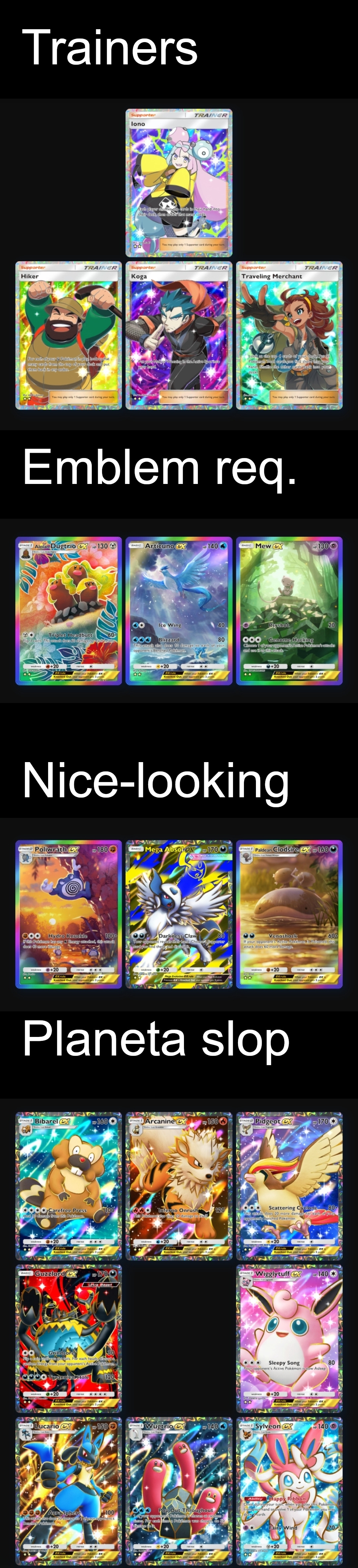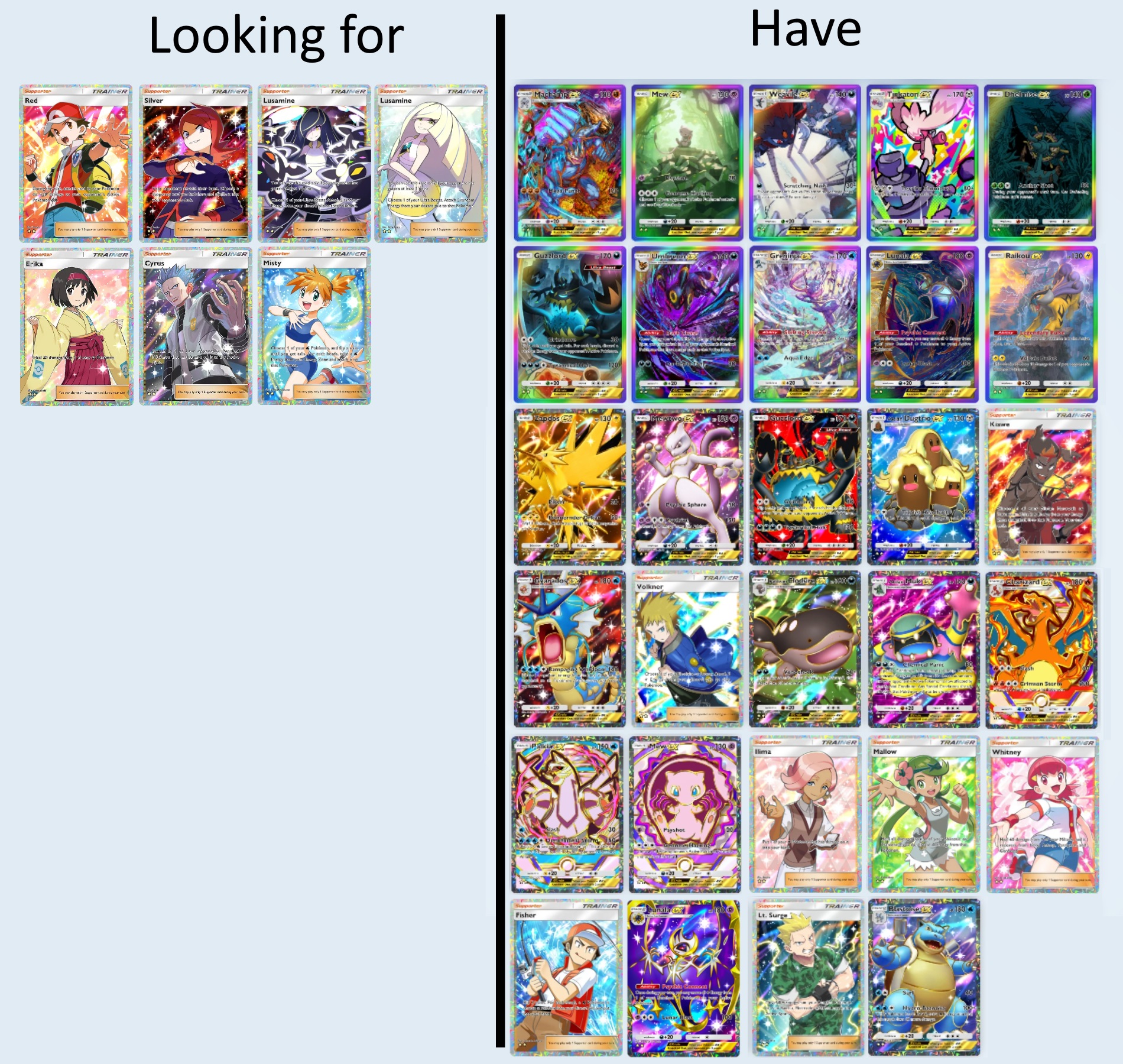 >>58538950Completely fell asleep at my desk, here's my list. >>58536970>>58538977I'll be honest, I feel like Whitney might be one of my last valuable cards, I'm not sure if I wanna let her go for an Absol. Was there anything else?
