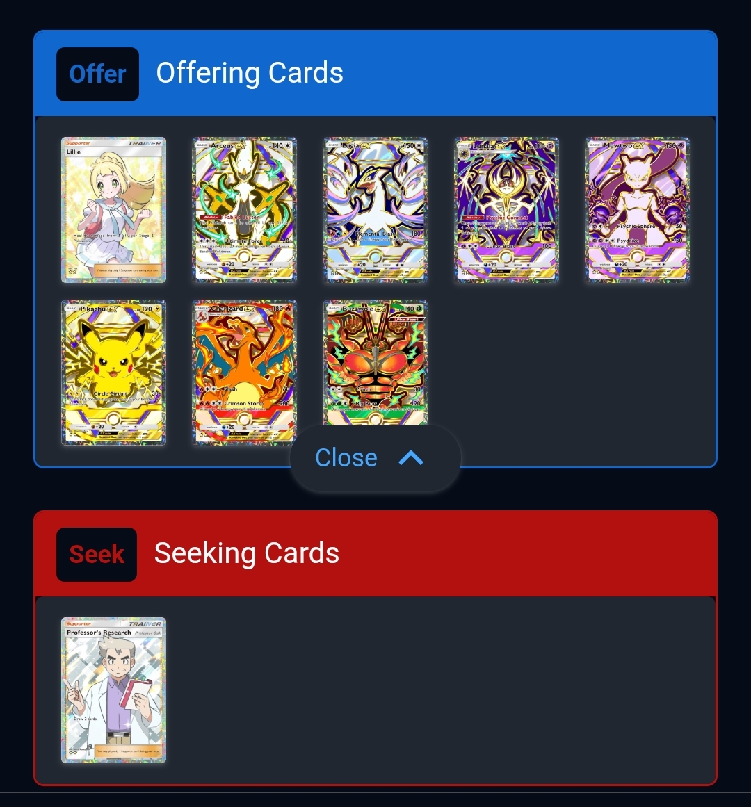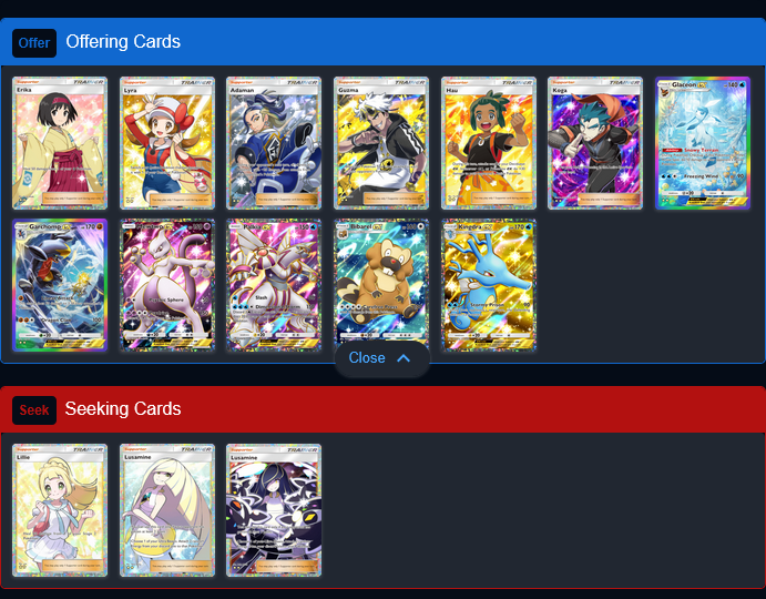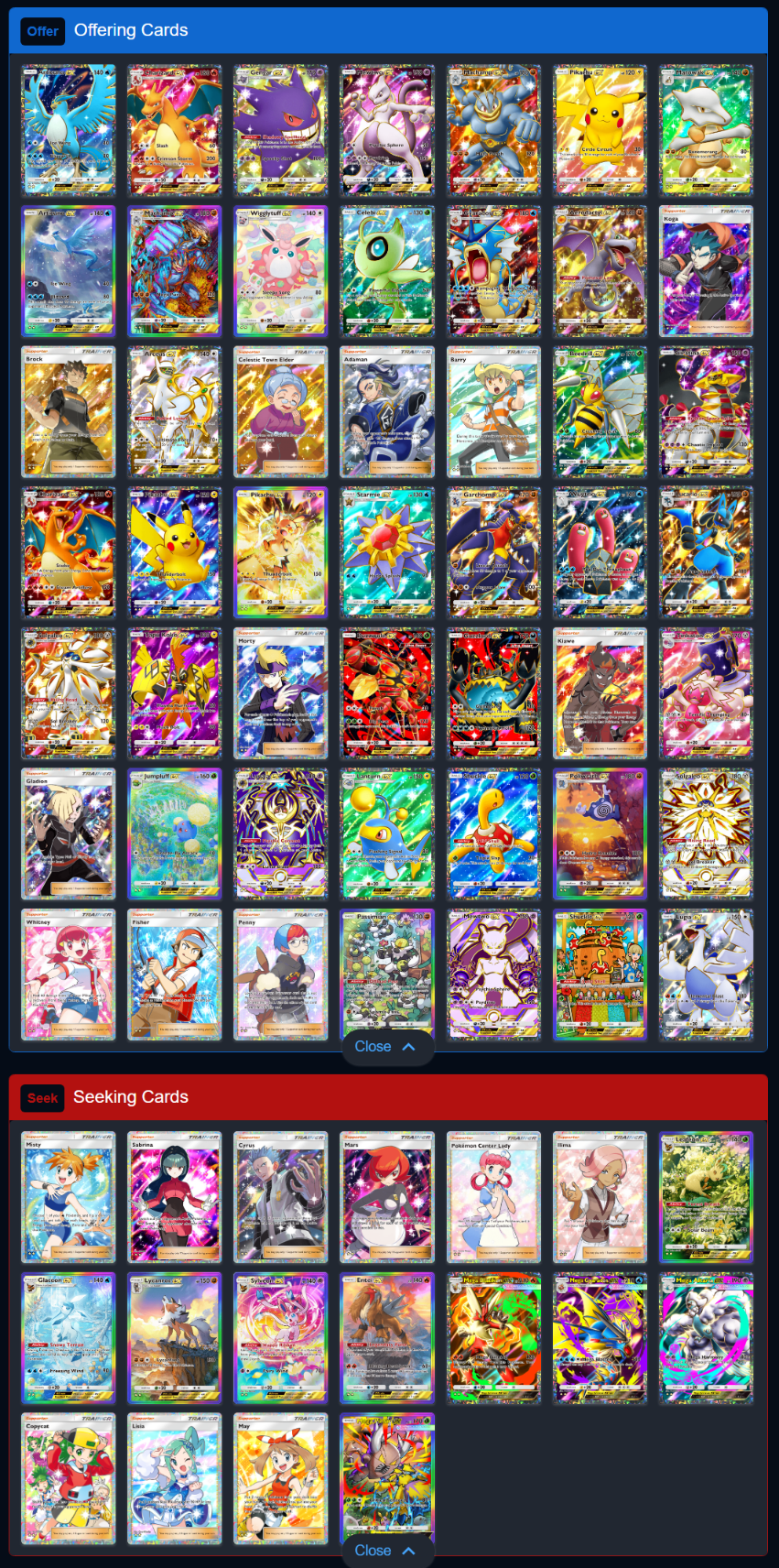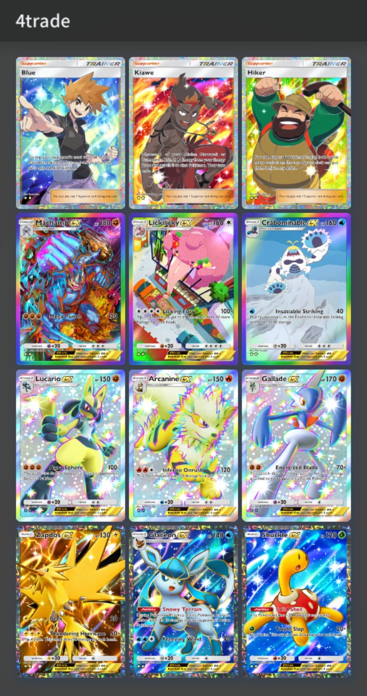 >>58536988What are you on about? If you scroll up like 15 posts, you can see 2 Anons trading a Whitney for a Misty. Do I expect someone to trade a Misty for a GA PlanetaZard? No, but I have other things listed like Whitney or Penny that people might be interested in. People still might need Brock or Koga for the GA FA trainer achievement. Someone might REALLY like Marowack. Either way, it's just what I have for trade.>>58536991https://game8.co/games/Pokemon-TCG-Pocket/archives/496009