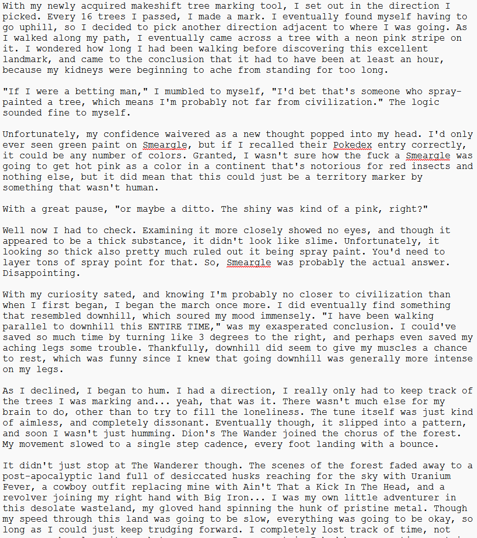 >>58595011I haven't read the entirety of the story yet, just part 4, but I quite enjoyed it. I enjoyed the interaction with the Dusknoir. It doesn't hold perhaps the gravitas that it should, given the situation these people are in, but it's charming that he's treating it as another Wednesday.>>58594620>There's even val-style tense snarlsI OBJECT TO BEING USED AS A NEGATIVE EXAMPLE >:PNah I find it funny that I've made these mistakes so god damn much that I'm now the name for them.>>58594534No worries, hope you slept well!It's not even complete anyways, I stopped writing it after getting a full page. Wasn't even sure what I wanted to incorporate.>>58594346>there are also just some people not native to english.Hey, in fairness, even the natives will struggle with it. I got a A- on my college English and I still struggle with English from time to time, and that's before you throw in the reversing effect.Granted, I live in California so the standards are subterranean for what qualifies as an A lol