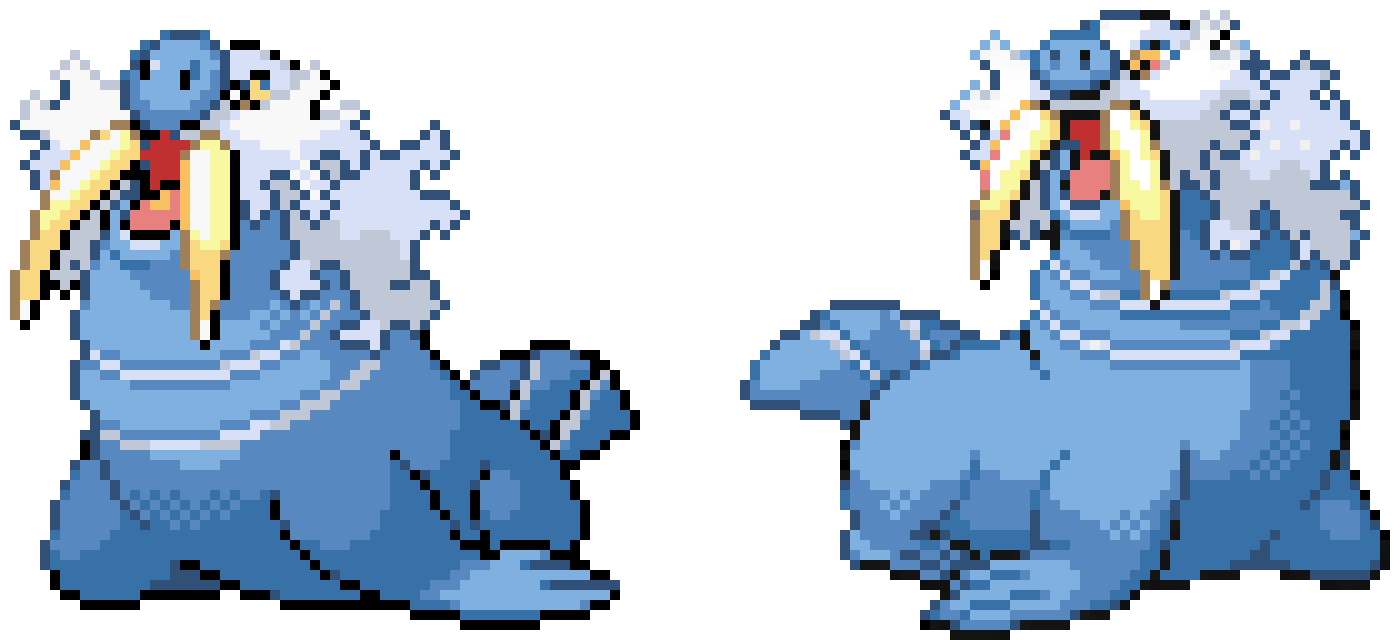 >>58589947You know, looking back at the sprites of Walrein, I think the reason why he wasn't very well-regarded is because he made a bad first impression. He started as an adorable round seal, but when he evolved into Walrein, he looked like the sprite on the left. He looked pretty angry and stupid and he had a big dumb nose. Gen 4 made some minor adjustments and he now looked less dumb and angry, but people already had it in their heads that hey didn't like him. With his adjusted design, I could easily have seen him as a starter, though maybe with a different typing.