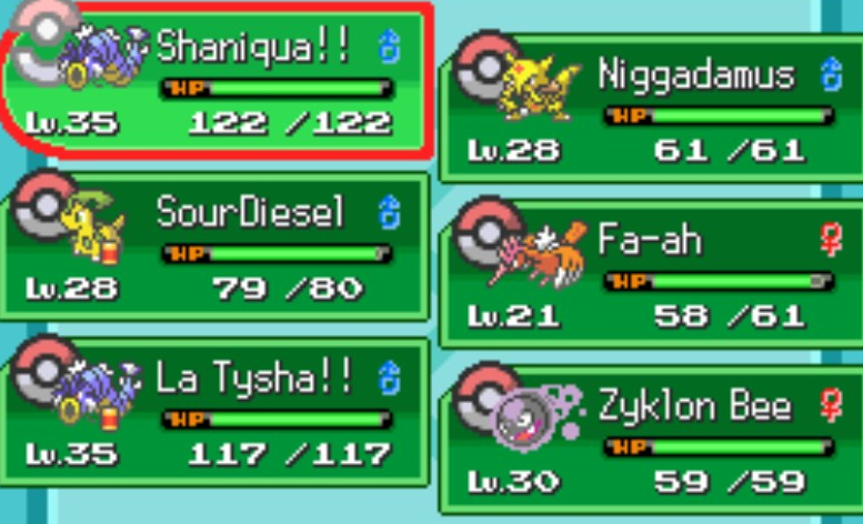 Usually this, just whatever pops into my head when I catch them. I was in Peru when I started this romhack so a couple of them are in Spanish, then my gf lost her dongle on the flight home, etc