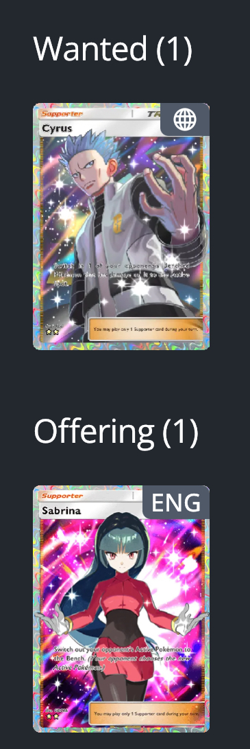 I traded my Lusamine DX for a Mars So now I can only offer a Lillie DX+Ampharos for Oak