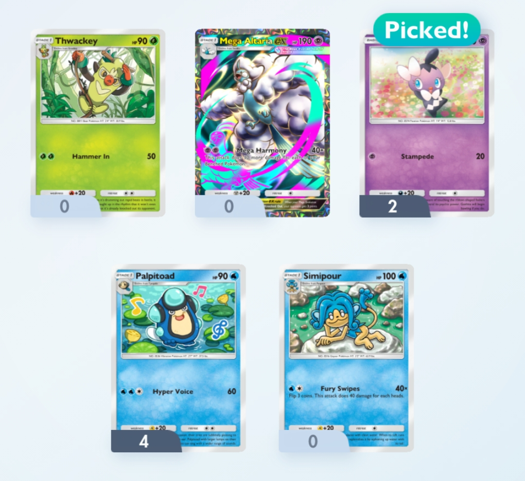 Bro lets me sit on his lap when we open packs>Friend ID Survey: https://forms.gle/AZyQQ2SfGeCKjXNh9>Friend ID Sheet: https://docs.google.com/spreadsheets/d/1DGhOfaMX6D_YUR-P39_OJdVmAl0uacohIRstE9oN9SQ/edit?usp=sharing>Tournament results/decklists: https://play.limitlesstcg.com/tournaments/completed?game=POCKET>Deck Builder: https://my.limitlesstcg.com/builder>Datamines, etc.: https://ptcgp.raenonx.cc/en>Luck calculator: https://porygonthree.github.io/ptcgp-luck-calculator/>Advanced card search: https://pocket.limitlesstcg.com/advanced>Mega Rising card list: https://www.pokemon-zone.com/sets/b1//vp/ battle passwords to battle with other Anons (consider writing a post to recruit players)>/vp/‘s own meta (no random effects, no ex): vpnx>meta decks or high level play: vpmeta>/vp/ anything: vpPrevious Thread: >>58605666