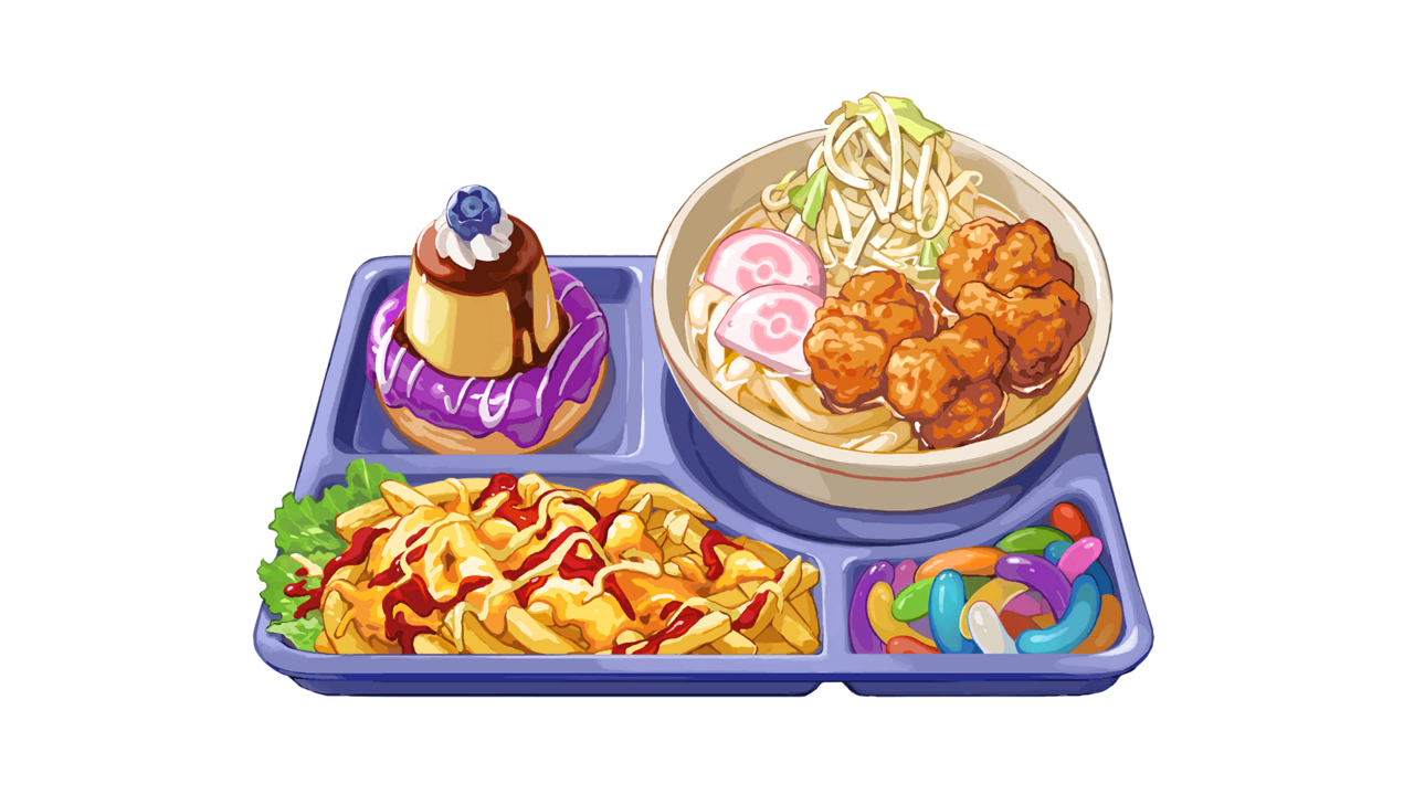 It's udon AND ramen, two different noodles in one bowl. And the fried chicken is just going to get soggy in the broth there. Also I think those jellybeans are actually gummy worms.