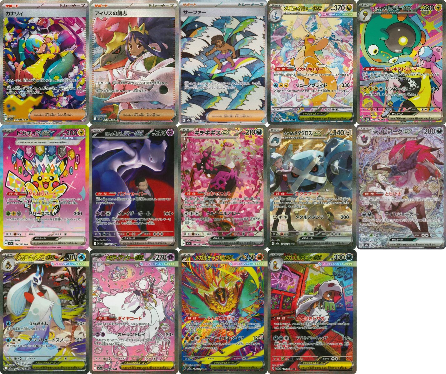 >>58682829For mega dream you are gaurenteed one of the new Mega Art Rares, 3 ARs and an SR. Boxes can contain 2+ SR. Honestly still pretty good. Just look at prices only Gengar and Dragonite are holding above $100. Every other SAR are under $50 which is nuts for release week. The chance to get an SAR in boxes must be pretty high for prices to fall this much when there's this many SARs available