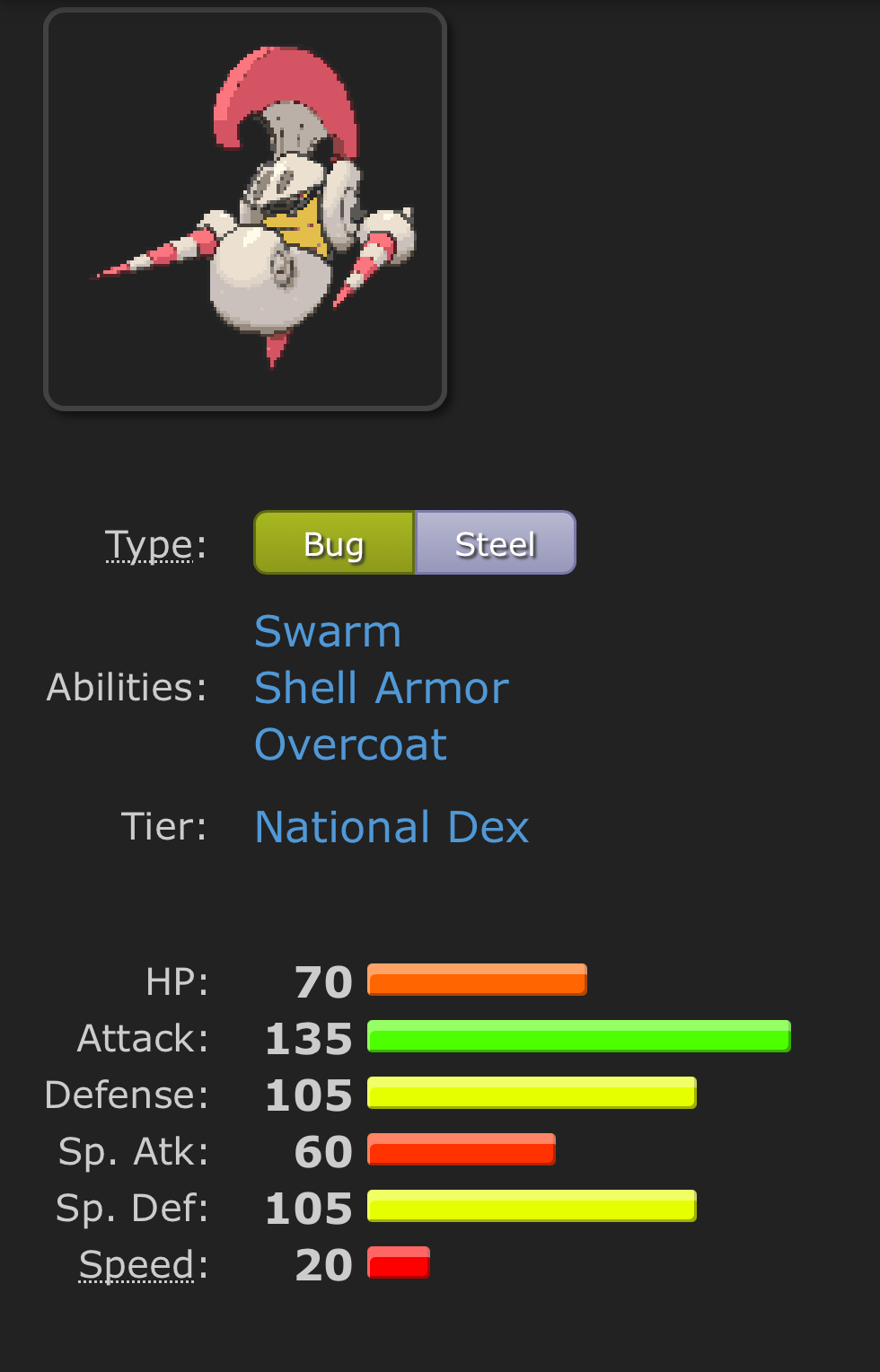 >>58719284HP: 75Attack: 150Defense: 175Sp. Attack: 70Sp. Defense: 120Speed: 40