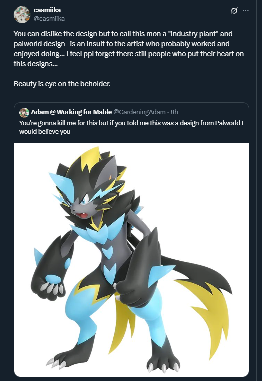 If anything, all Palworld did was prove that the best approach is just to put all bets on furbait designs, just as Palworld did, i truly believe people calling Z Lucario a Palworld design stems from the curvy way they designed it (thigh highs furbait mega) and not from the tacky bits added.