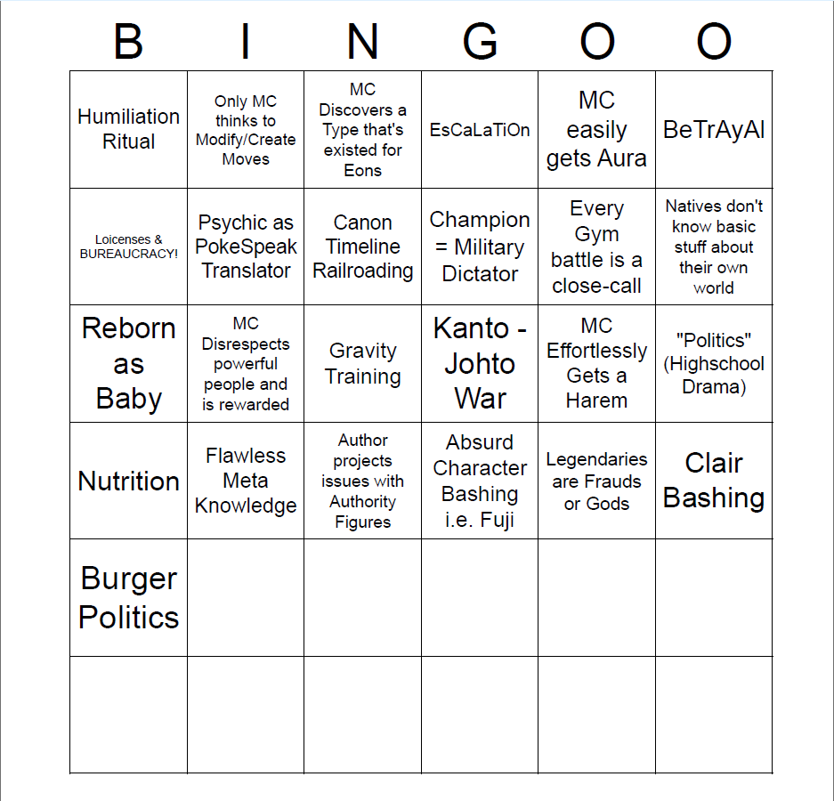 >>58737223The sad thing about this one is inter-regional pokemon wars could make for sick worldbuilding but authors don't do anything with it except bitch about nationalism. Most of the stuff on the list is dumb in itself but pitting the gen 1-2 settings against each other could be so cool in the right hands