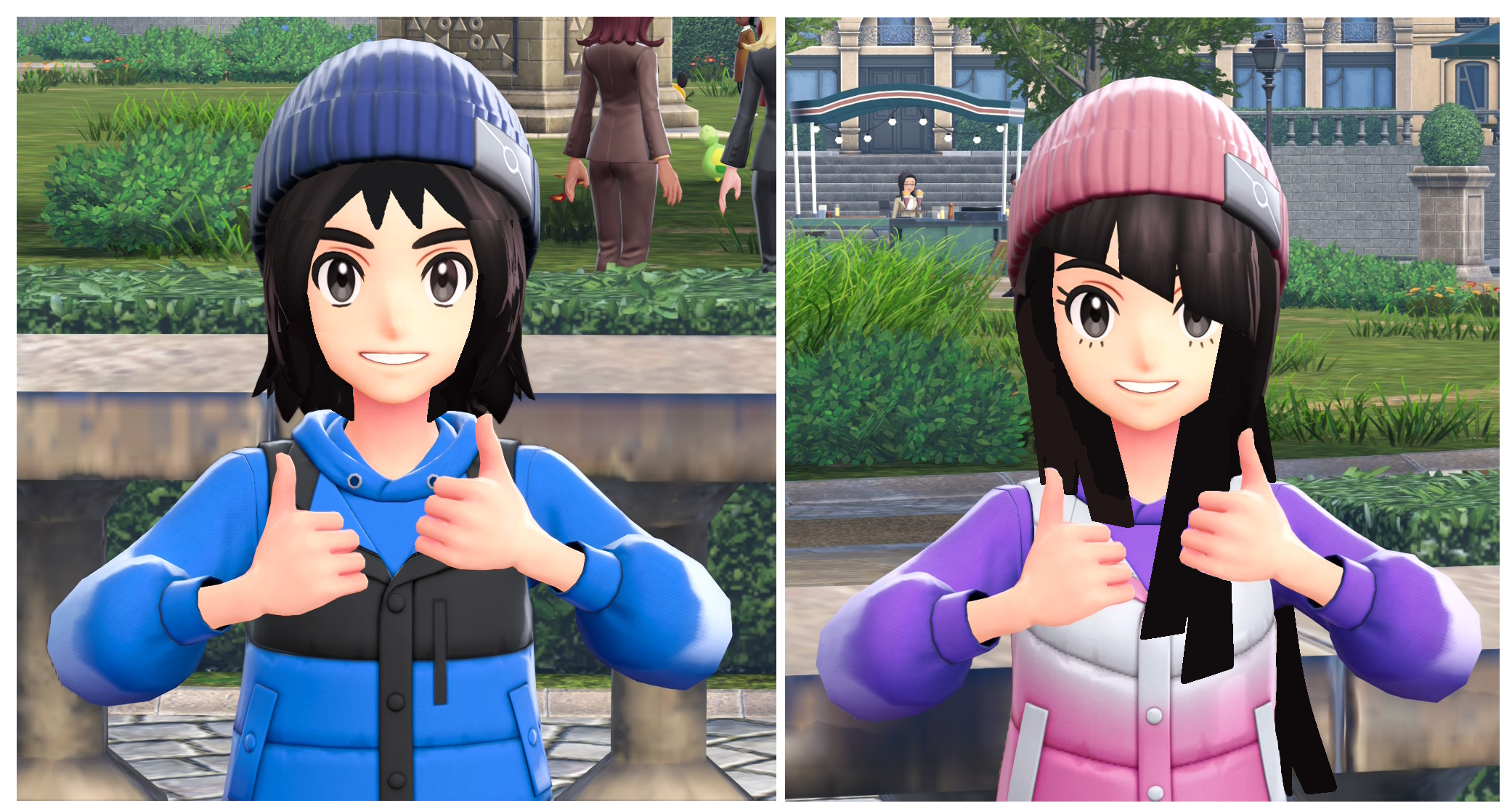 You're welcome. I used good ol' MS paint on these screenshots to give the girl on the right a very attractive, long, waist length Hime Cut and the boy on the left has a thicker Bob, so their hairstyles makes them look more Anime style and Japanese.Let me know what you think of my trainers. Do you think they're very attractive? Character Customization really is a dream come true sometimes.