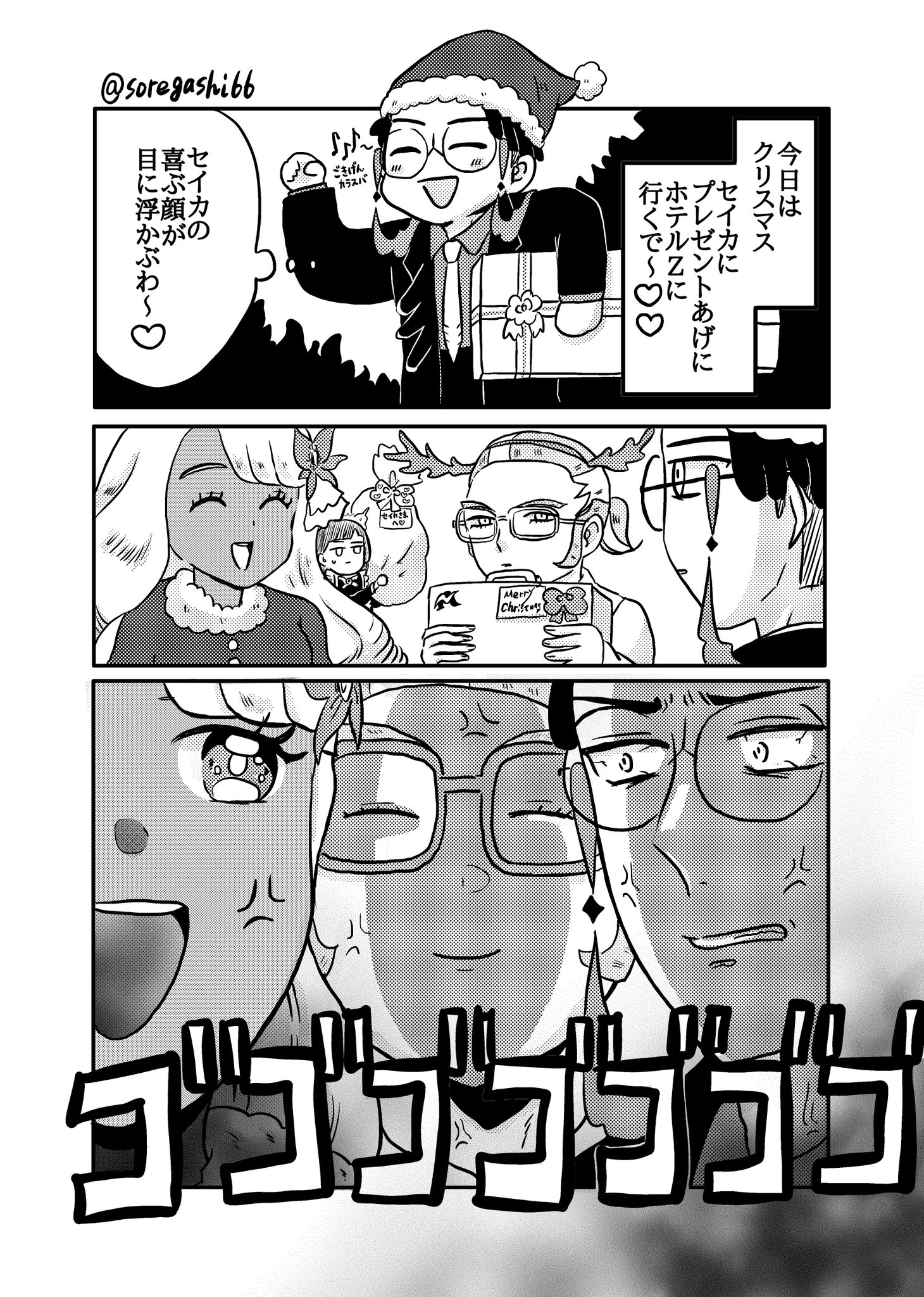 Christmas comic, not mainly about Jacinthe but she’s funny here.Google translate was kind of a mess again so there’s some inaccuracy/missed nuancesCorbeau:>Today is Christmas. I'm going to Hotel Z to give Harmony a present. I can just picture Harmony’s happy face ~ <3