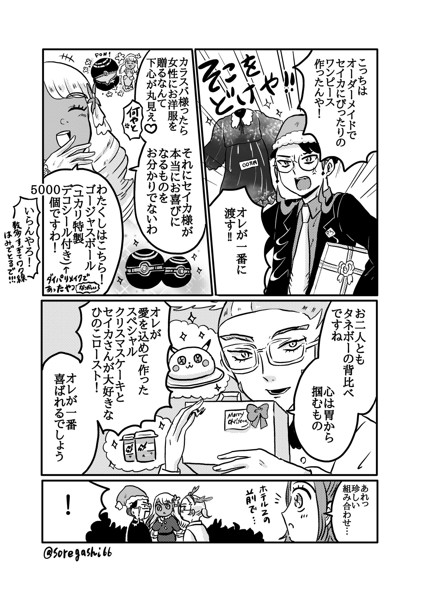 >>58779519Corbeau:>I had this dress custom-made, perfectly tailored for Harmony! I’ll give it to her first!Jacinthe:>Corbeau, giving a woman clothes is obviously an ulterior motive <3Corbeau:>What?!Jacinthe:>And you don't know what truly makes Harmony happy.>Here I am! Luxury Balls (Special Jacinthe edition with decorative stickers) 5000 of them! <- (Artist note: This was in the Diamond and Pearl remakes.)Corbeau:>No need! There’s so many that they’re going beyond the panel line!!!Grisham:>You two are comparing heights like Seedot. The way to a person's heart is through their stomach.>I've made a special Christmas cake with love, and Harmony’s favorite Hinoko roast! I'm sure I'll be the one who gets the most appreciation!Harmony:>That’s a rare combination… In front of the hotel…