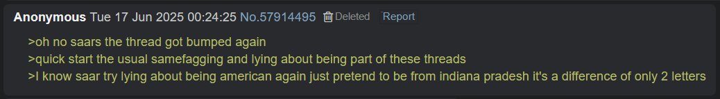 >>58782698>for some reason the jannies are really bad when it comes to permabanning IPs obviously just being used to shit up the board, or actually filtering out spam postsJannies are weird about these threads, they'll delete the Jeet copypastas, but no other kinds of off-topic spam, and they never think "gee, maybe we should just delete this thread if it's attracting so much off-topic spam"