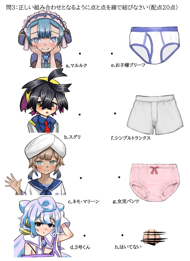>>58843724Cute Marines!Kieran would get along well with Captain I think.>Question 3: Connect the dots to find the correct combination (20 Points)a. Marulk b. Kieranc. Nemo Marinesd. Hacka Doll No. 3e. Kid's briefsf. Regular trunks (lit. simple trunks)g. Girl's panties h. nothing (lit. it isn't there)