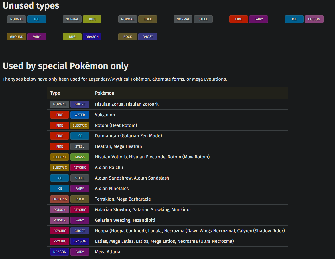 >>58795745Hey I remember our conversation from >>58794806 >>58794988Bulbapedia has a good page showing all type combinations and their abundance: https://bulbapedia.bulbagarden.net/wiki/List_of_type_combinations_by_abundance#All_type_combinations_and_their_abundanceSort the last column by Total. There are 81 combinations with three or less Pokemon total. Many of the 3's are single families, like Pawniard/Bisharp/Kingambit for Dark/Steel.Really surprising that Tyranitar is the only Rock/Dark Pokemon. You would think with so many Pokemon exclusive to dark caves, we would see more of them. Or, you know, Midnight Lycanroc.
