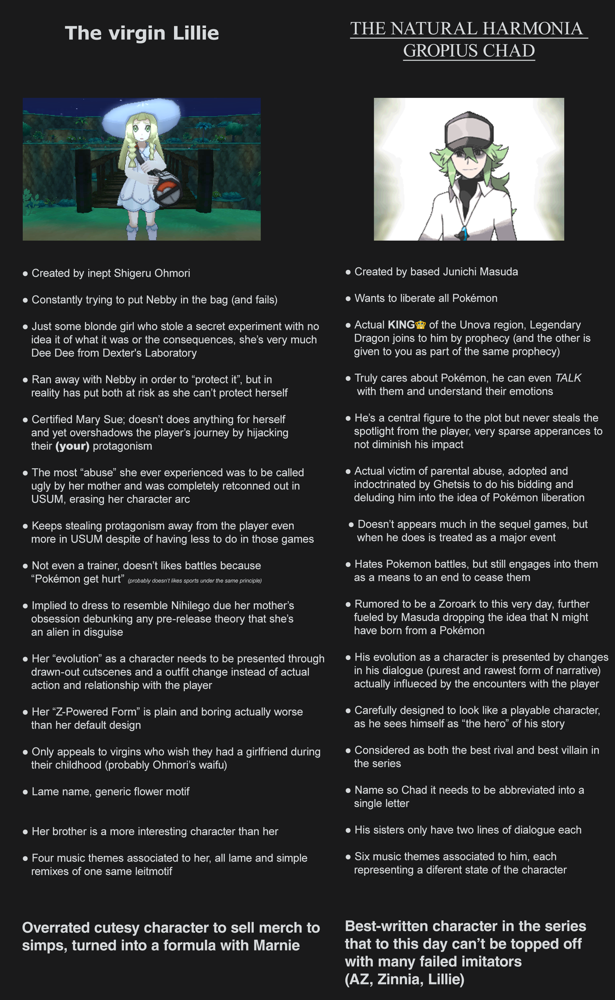 >>58806090they're both lame OCs, don't get why that autist N is loved so much. "oh wow is me, I was born an orphan and can speak to animals and I have a castle that is built around the pokemon league and shieeeeeet :D"