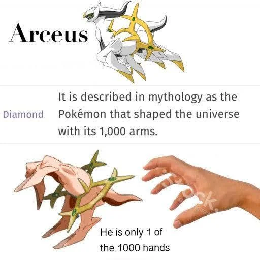 >>58806806>Good idea for a thread though.Thanks, I hope you don't mind me discussing this further then.Since the Pokemon form is only an avatar of Arceus, isn't it fair to say that this avatar is only just one of the "1,000" hands of Arceus also? And the number 1,000 itself may be just a figure of speech and not literal, as if the number is actually immeasurable.It's confusing to say what is canon or not in Pokemon. There is also the Gamefreak programmers within Pokemon and trading is commonly talked about, as if some of the characters in the game are aware that they are in one.