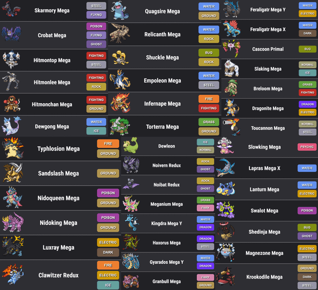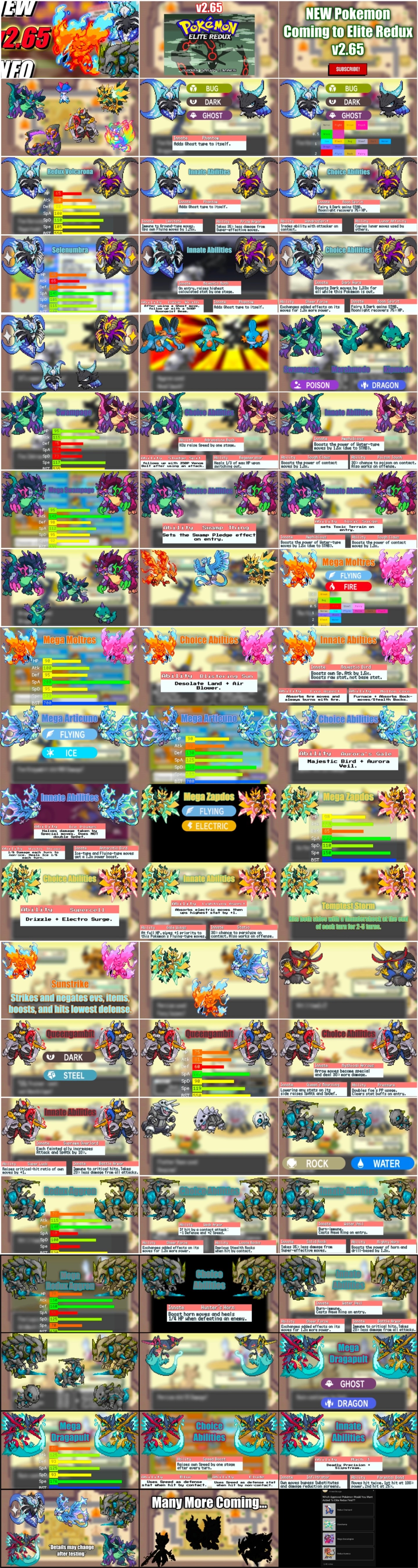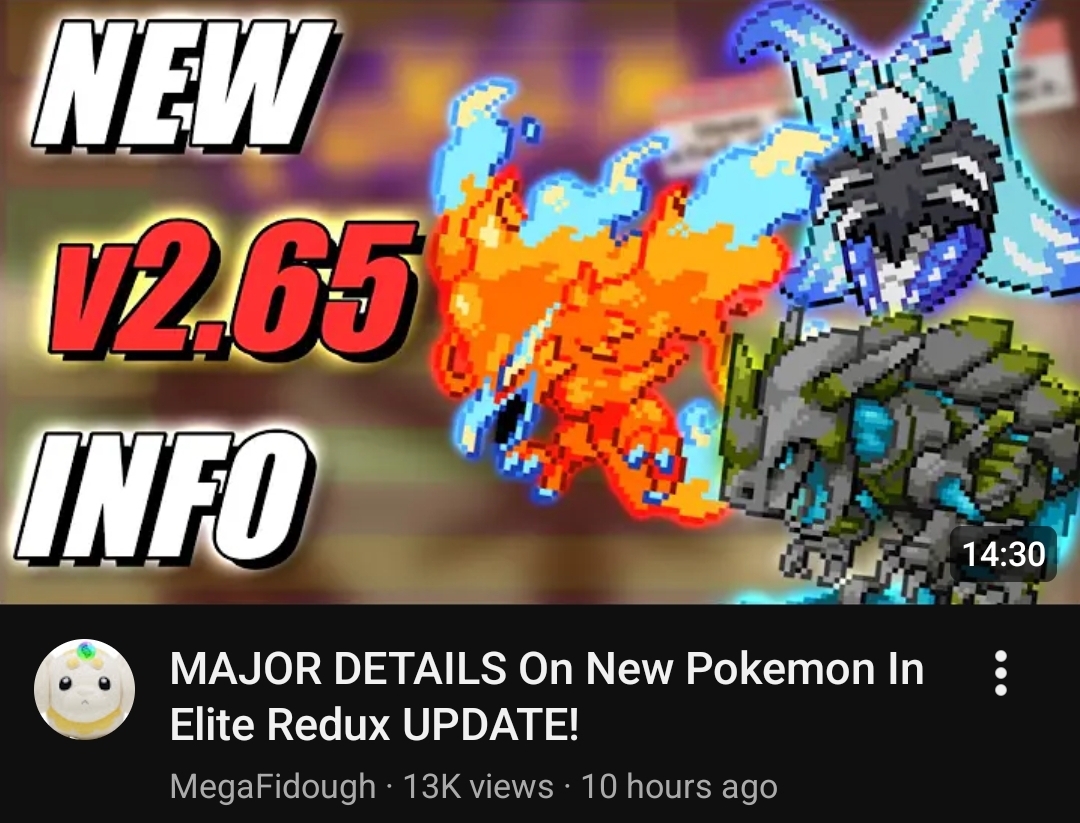 >>58822569https://files.catbox.moe/99p9zy.pngThe guy who uploads these Elite Redux videos, MegaFidough, made a community post about it 2 weeks ago. It looks like they also re-designed Mega-Dragonite, Mega-Weavile, Mega-Typhlosion-H, and Mega-Milotic. That Weavile desperately needed a new design.It looks like he's also uploaded some stuff relating to the new Z:A megas, as well as some custom new Mega/Redux/Convergent/Paradox forms. There's also some examples of the 2 bew shinies project, before and after of the new tilesets, a snowy Mossdeep City, and a new area. All stuff he hasn't posted in his videos. Maybe you could find it all probing the server idk, lots of shit in there though. I did do some digging and added some of the custom Pokemon that the community made and were approved for future versions at the bottom. >>58824217You have good taste. I can't believe they gave the Redux Volcarona an evolution, but I'm not complaining either, it looks so cool.>>58825400Thirding what the other anons said about team-building. Team-building is so satisfying in this hack because of the way certain abilities stack, the new moves and abilities created to compliment, and many receiving buffs.The game has a huge learning curve though. Not only are you learning about all the new moves, abilities, and Pokemon... you also need to learn the ways in which every old move and Ability has changed.-- Hidden Power buffed from 60 -> 80 power... also Secret Power has been turned into s Physical Hidden Power clone. This means that every Pokemon in the game has access to an 80BP Physical and Special move of any type.-- Shock Wave, Flame Burst, and Water Gun have all been made priority moves-- Big Pecks is now a Tough Claws clone-- Shell/Battle Armor now reduce incoming damage by 20%, as well as the usual crit immunityYou could go on and on. I just use the online Pokedex and inspect every ability, even the familiar ones.