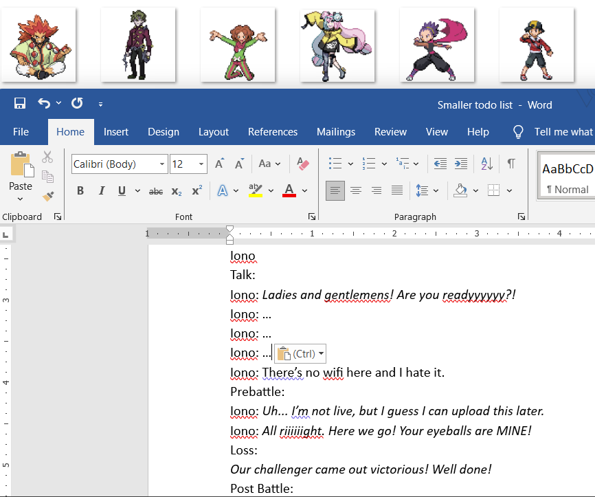 >>58823158Final 6 added to game, now all I have to do is write their dialog, add them to the tower/PWT, and then I can set up the last of the tournaments. From there, I'll start working on some sprite fixes I've been putting cleaning up some maps, and I might be done?