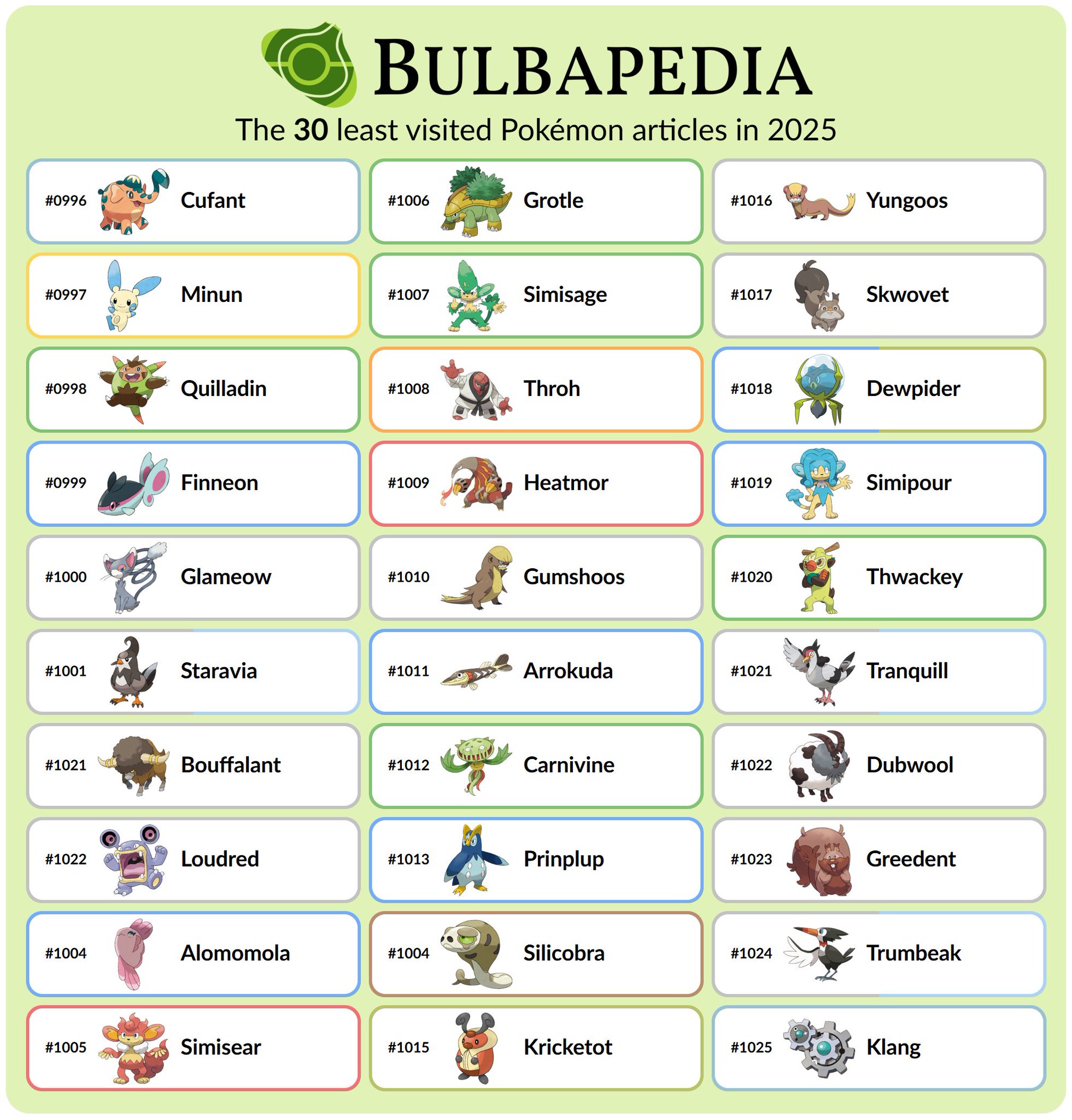 >>58807421bottom 100https://bulbapedia.bulbagarden.net/wiki/Bulbapedia:Most_and_least_visited_Pok%C3%A9mon_articles_in_2025