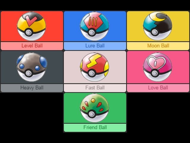 >>58810016Level Ball - Ampharos, BeedrillLure Ball - Feraligatr lineMoon Ball - Umbreon, Clefairy lineHeavy Ball - SnorlaxFast Ball - Pikachu lineLove Ball - Jigglypuff line, Chansey lineFriend Ball - Scyther, Spinarak, Caterpie, Bellossom, Natu line