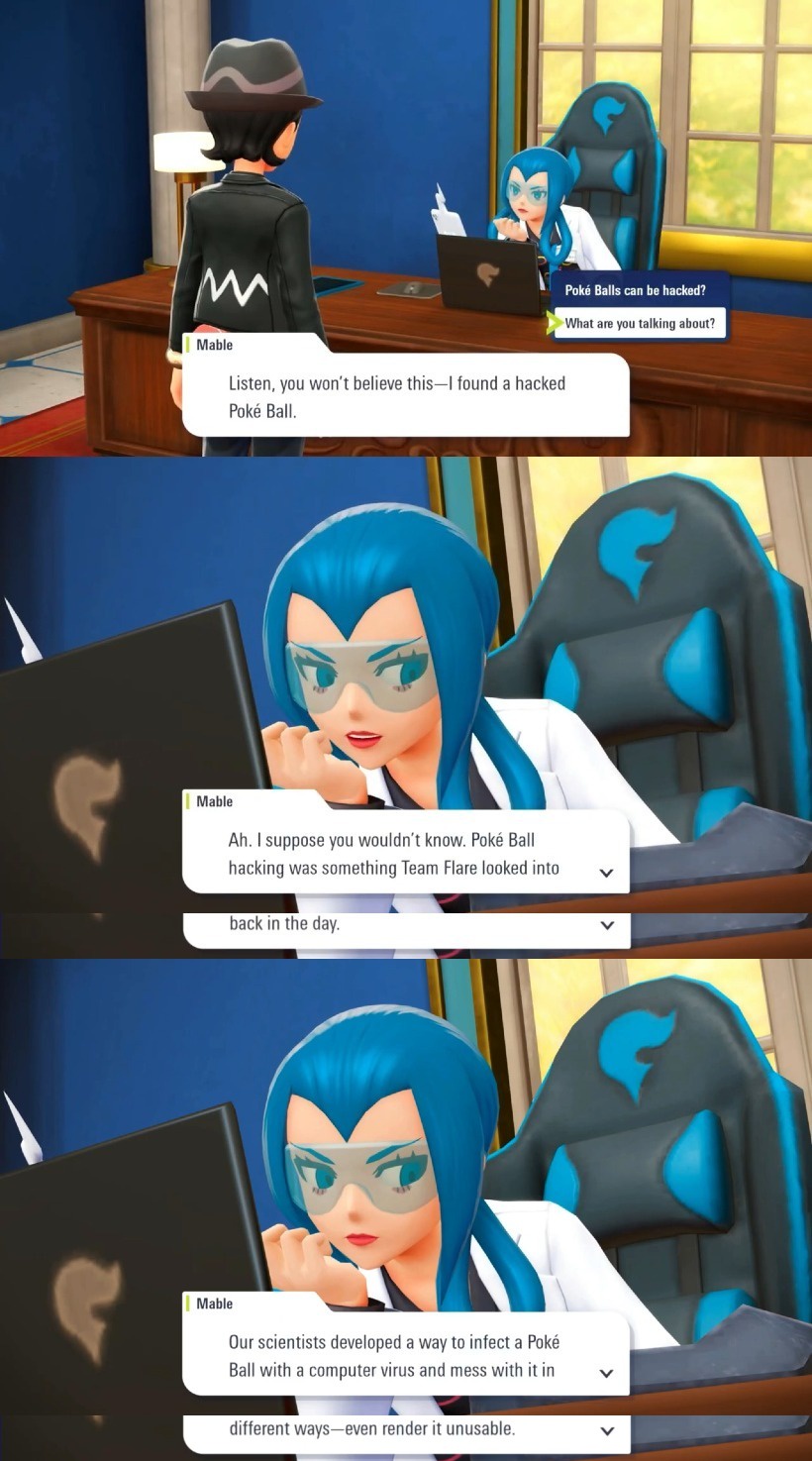 >>58810211We knew this since SV, technically even earlier, as far back as Colosseum. In SV the Paradise Protection Protocol initiates a lockdown on all Pokeballs not registered to the professor, which forces the player to send out the cowardly raidon to battle because their own wouldn't come out. In Colosseum/Gale of Darkness the Snag Machines override the Pokeball registration process to enable them to catch Pokemon already registered to another Pokeball. In both instances Pokeballs are hacked.